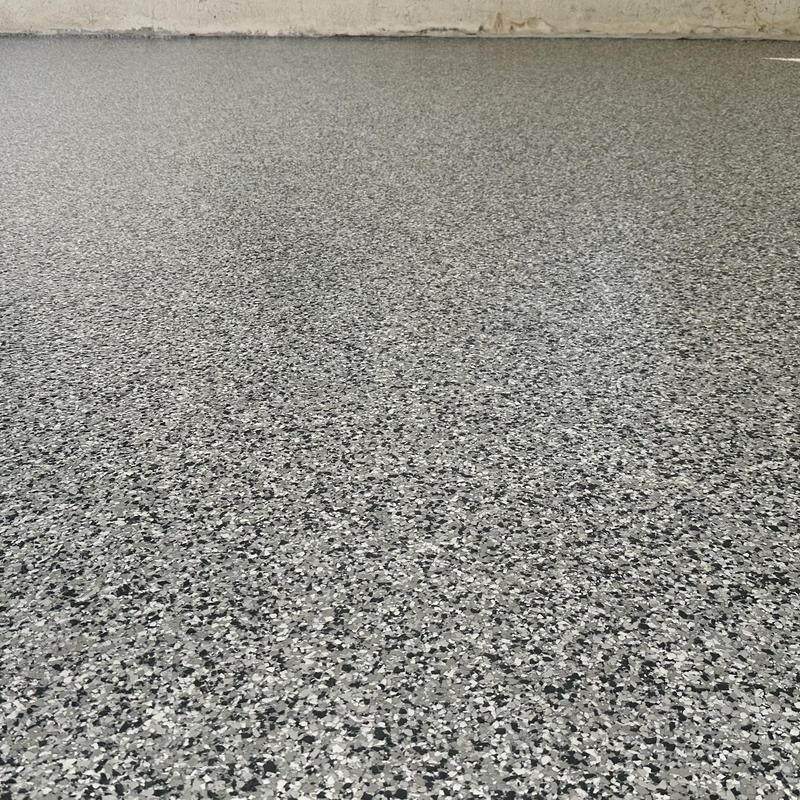 Exclusive Epoxy Coatings removed two layers of existing paint from a garage floor in Atlanta, Georgia. The team then prepared the surface to the correct concrete surface profile (CSP) and applied an epoxy hybrid stone flake coating.