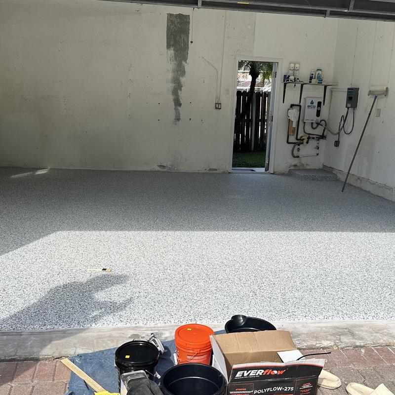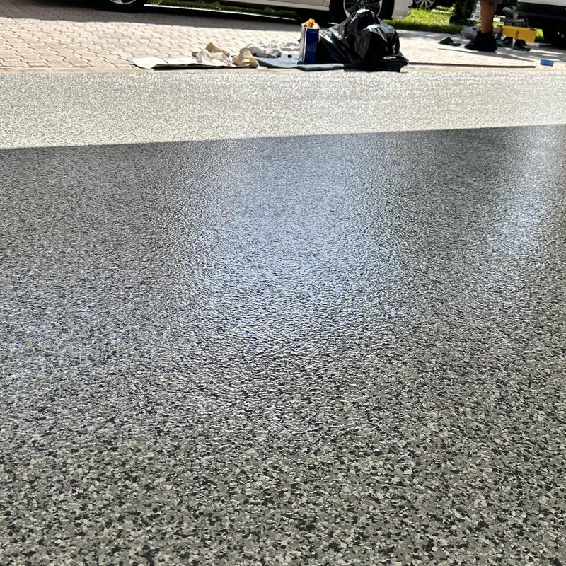 Exclusive Epoxy Coatings applied an Epoxy Gravel Flake system on a garage floor in Pembroke Pines, Florida. The process included floor grinding, an epoxy vapor barrier base, a full flake broadcast, and a polyaspartic topcoat for added durability and coverage.