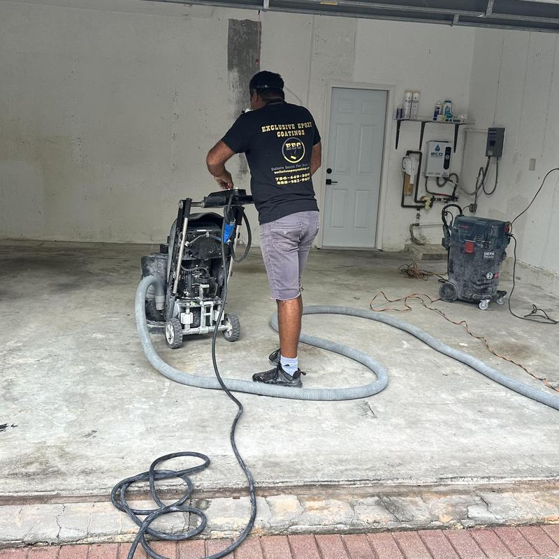 Exclusive Epoxy Coatings completed garage floor preparation in Apopka, Florida. The team began grinding the surface at 8 a.m. to ensure proper adhesion for the next epoxy application stage. This process helps create a clean and even base for durable garage flooring.