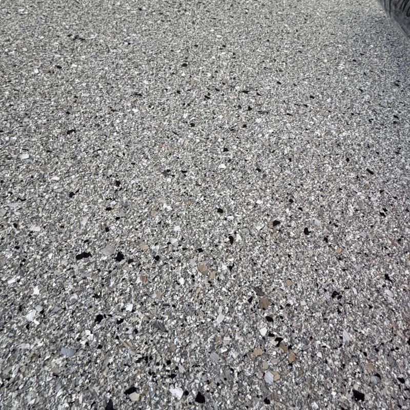 Exclusive Epoxy Coatings applied an Epoxy Gravel Flake system on a garage floor in Pembroke Pines, Florida. The process included floor grinding, an epoxy vapor barrier base, a full flake broadcast, and a polyaspartic topcoat for added durability and coverage.