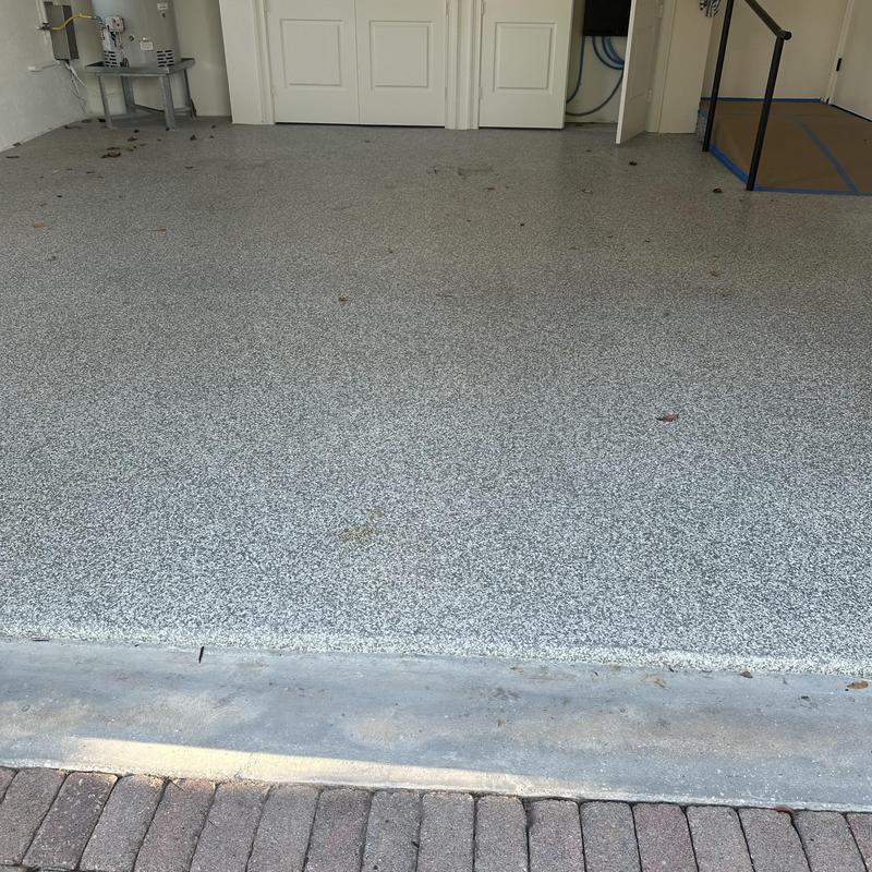Exclusive Epoxy Coatings installed an Epoxy Shoreline Flake Garage Floor in Cocoa, Florida. The team completed the project in one day, starting at 9:00 AM and finishing at 3:30 PM. The service included a full garage floor coating using their one-day epoxy system.