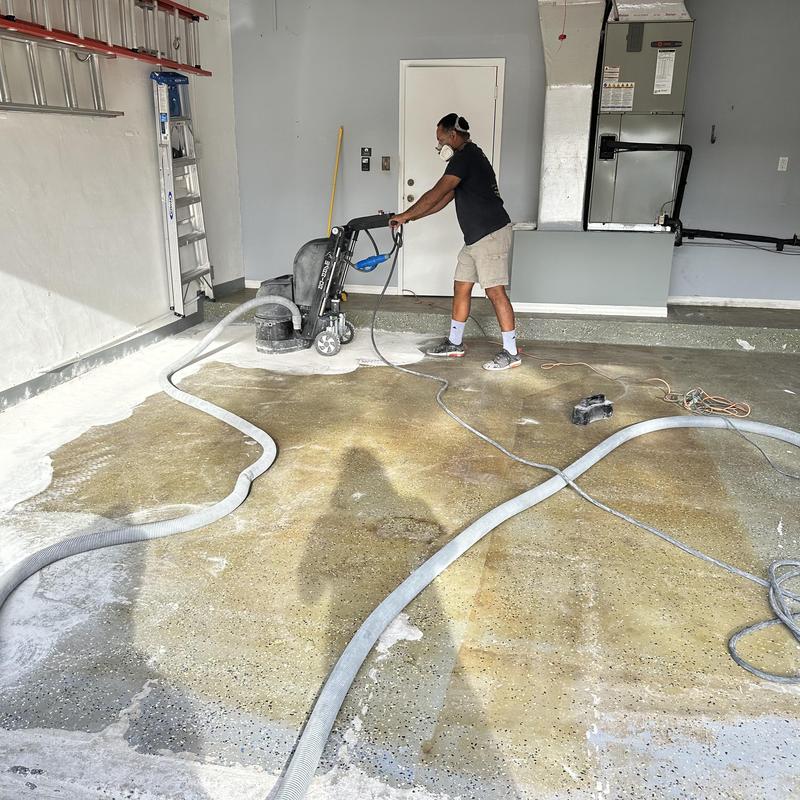 Exclusive Epoxy Coatings completed garage floor preparation in Apopka, Florida. The team began grinding the surface at 8 a.m. to ensure proper adhesion for the next epoxy application stage. This process helps create a clean and even base for durable garage flooring.