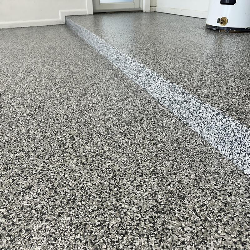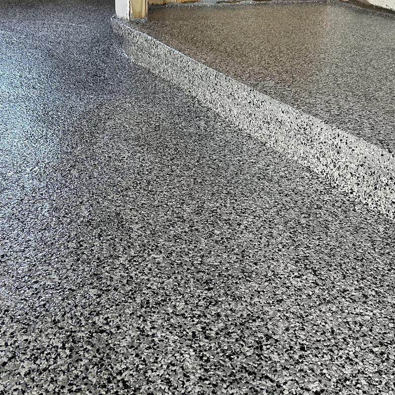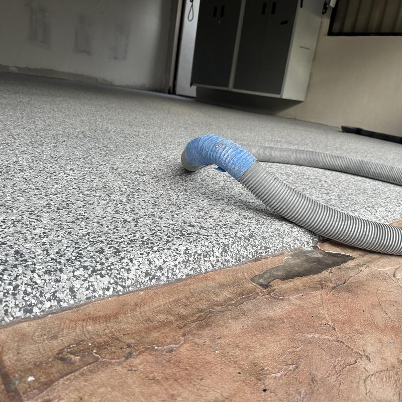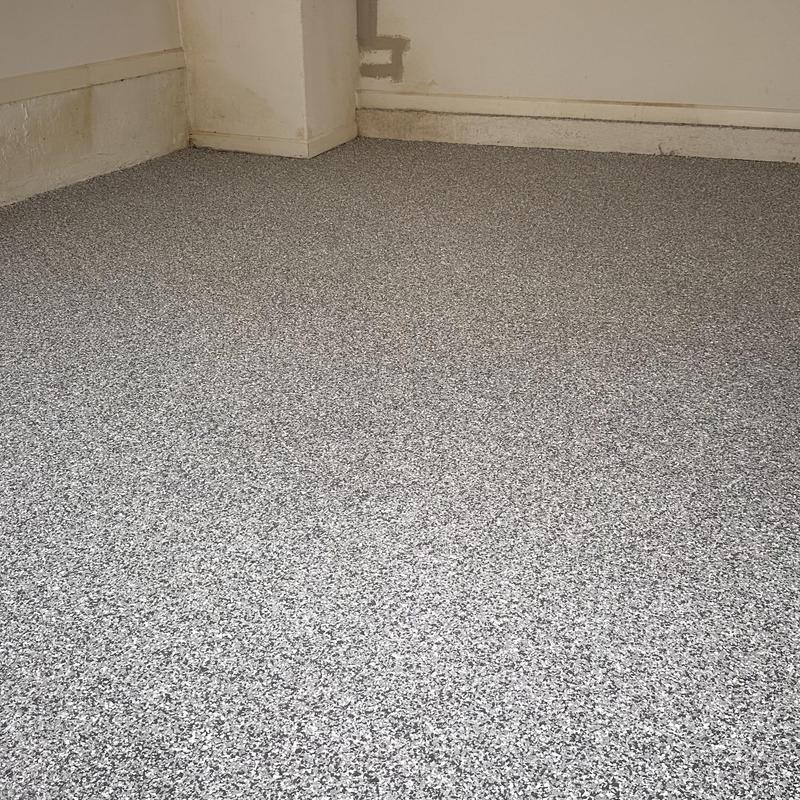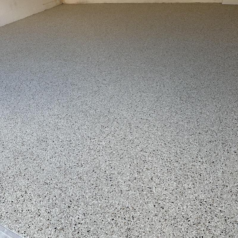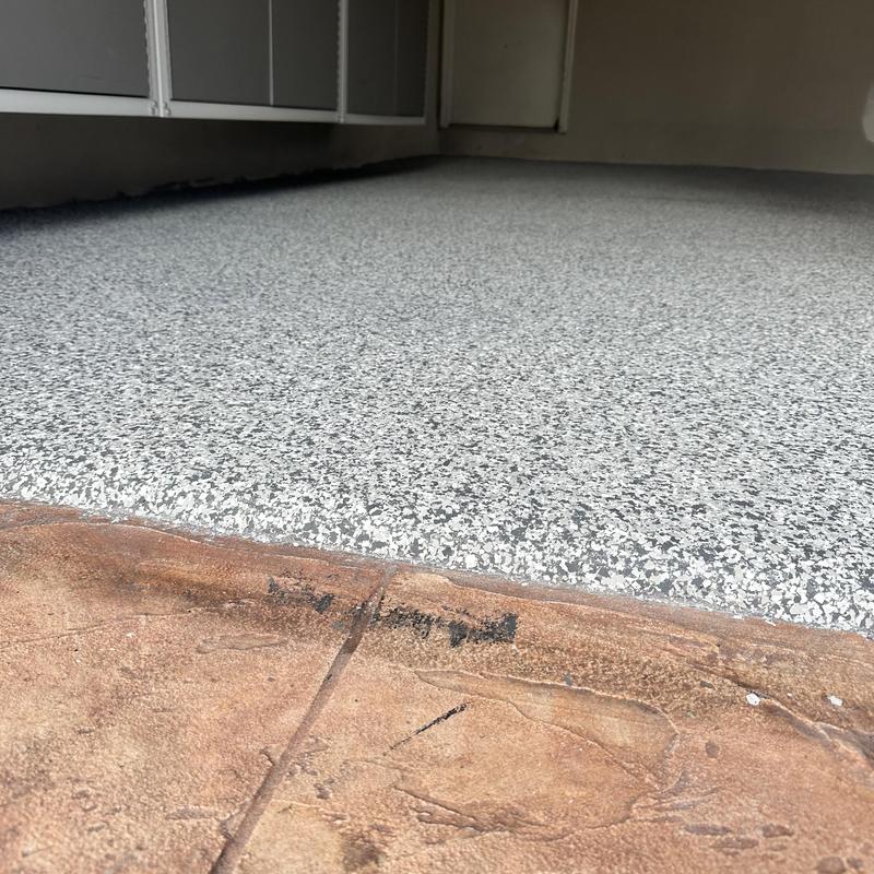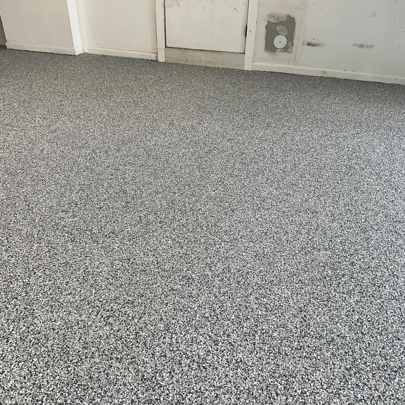 Exclusive Epoxy Coatings removed two layers of existing paint from a garage floor in Atlanta, Georgia. The team then prepared the surface to the correct concrete surface profile (CSP) and applied an epoxy hybrid stone flake coating.