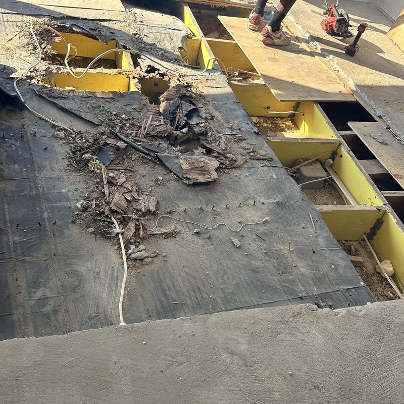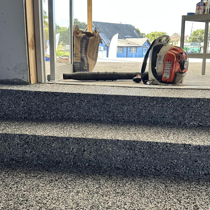 Exclusive Epoxy Coatings installed an Epoxy Domino Flake System in Nassau, Bahamas. The project involved repairing a heavily damaged floor before applying the new coating. This process ensured the surface was properly prepared for a durable and smooth epoxy finish suitable for long-term use.