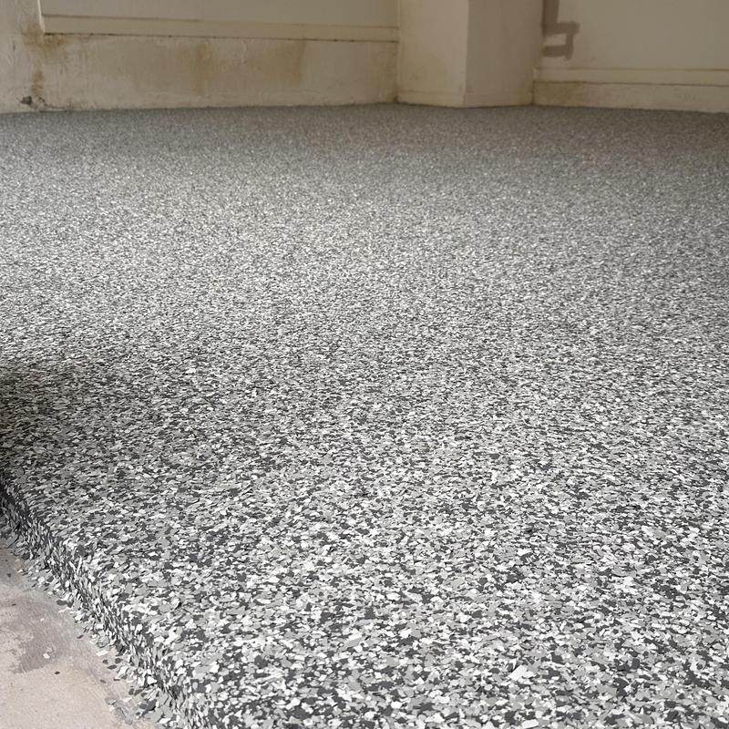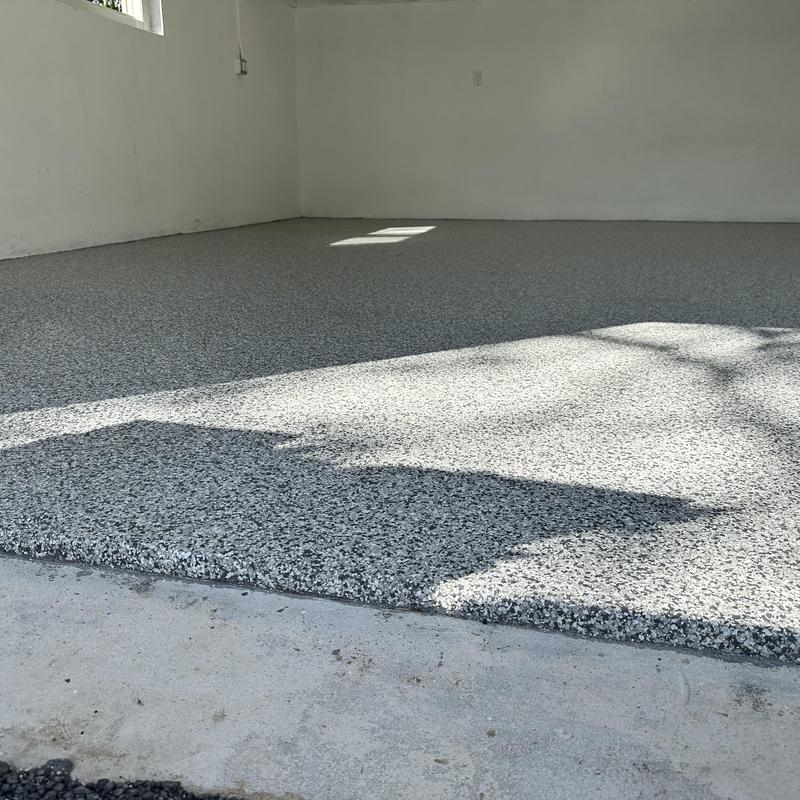 Exclusive Epoxy Coatings installed an Epoxy Gravel Flake system on a garage floor in Pembroke Pines, Florida. This system provides a durable surface that supports vehicle use and resists wear from frequent activity. The project focused on improving floor strength and appearance with a multi-layer epoxy and flake application.