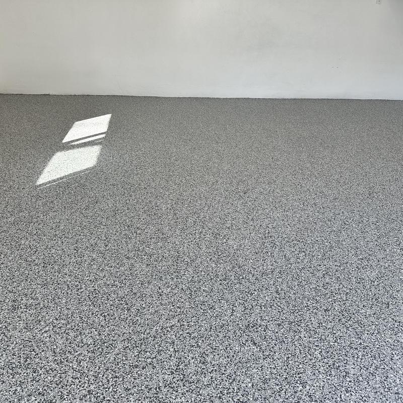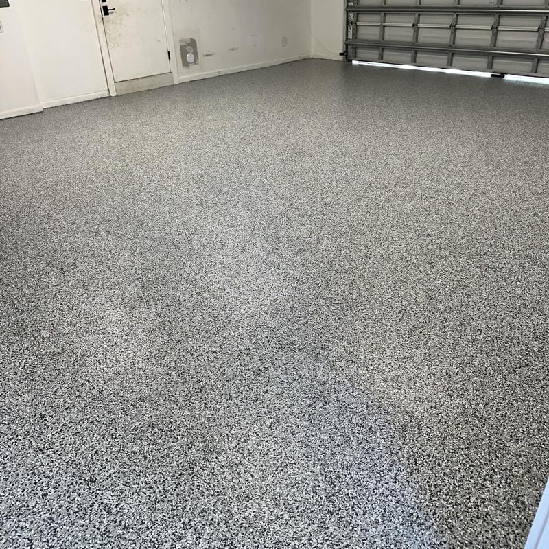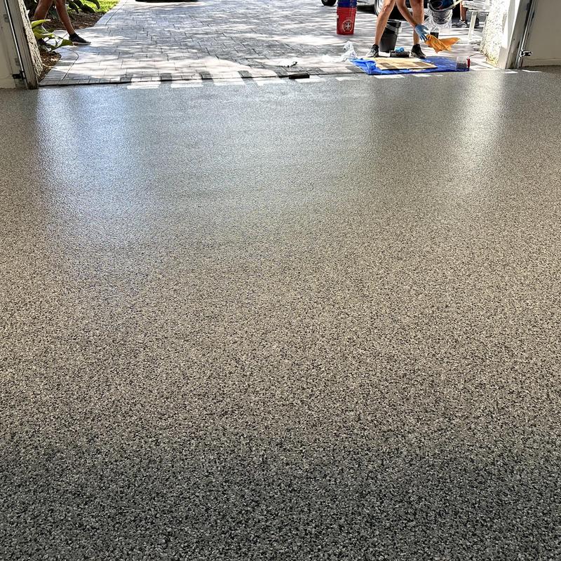 Exclusive Epoxy Coatings applied an Epoxy Gravel Flake system on a garage floor in Pembroke Pines, Florida. The process included floor grinding, an epoxy vapor barrier base, a full flake broadcast, and a polyaspartic topcoat for added durability and coverage.