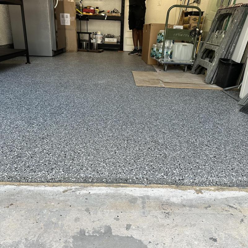 Exclusive Epoxy Coatings installed an epoxy flake system on a garage floor in Pembroke Pines, Florida. The coating provides strong durability, a clean finish, and resistance to wear, making it suitable for high-use areas. This surface is easy to maintain and built to last under constant use.