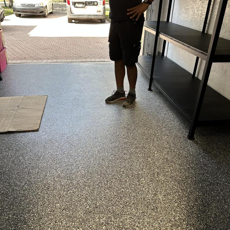 Exclusive Epoxy Coatings installed a one-day epoxy Cabin Fever flake system on a garage floor in Miramar, Florida. This coating provides consistent surface coverage and improves floor durability.