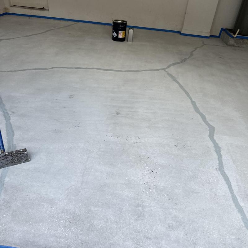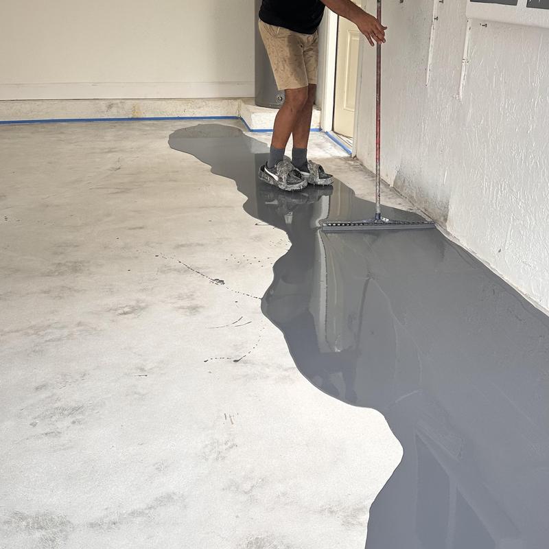 Exclusive Epoxy Coatings applied an epoxy moisture barrier after grinding and cleaning the first-story floor. This process is part of their full epoxy flooring system installation in Davie, Florida.