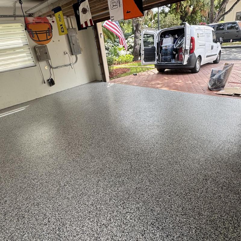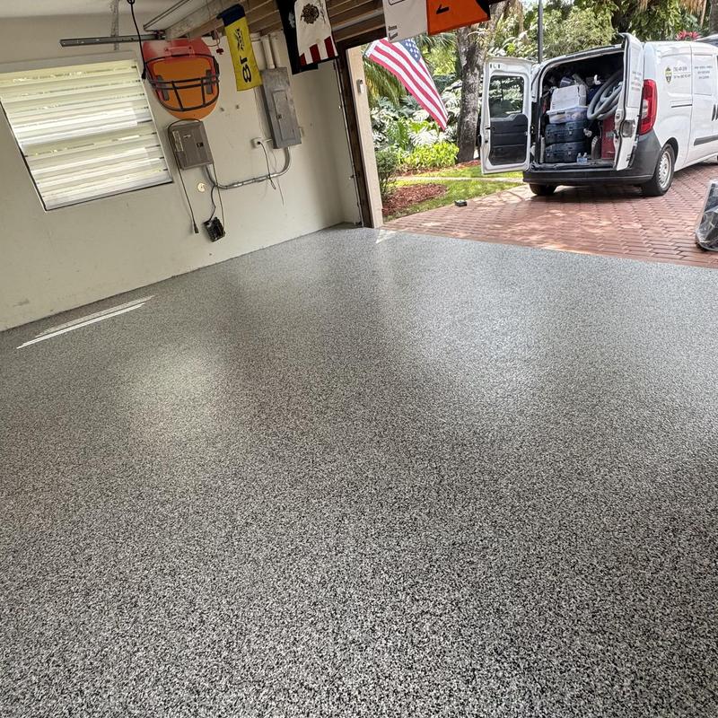 Exclusive Epoxy Coatings installed an epoxy flake flooring system in a 1,500-square-foot garage in Pinecrest, Florida. The project improved the floor's surface with a durable coating suited for high-traffic residential use. This installation helps protect the concrete and supports long-term performance in garage environments.
