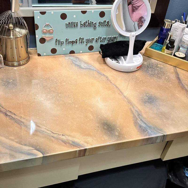 Exclusive Epoxy Coatings inspected Liquid Marble Epoxy Countertops in Hallandale Beach, Florida, nearly four years after installation over a Formica surface. The countertops remained glossy and durable, providing confirmation of long-term performance. This follow-up supported the start of a new epoxy project for the same homeowners.