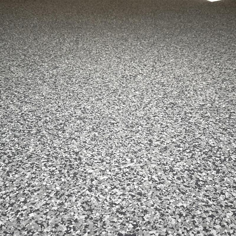 Exclusive Epoxy Coatings installed an Epoxy Nightfall flake flooring system in a residential garage in Plantation, Florida. The finish features a mix of light and dark grey tones with black flakes. This epoxy flake floor offers controlled flake distribution for a consistent and durable surface.