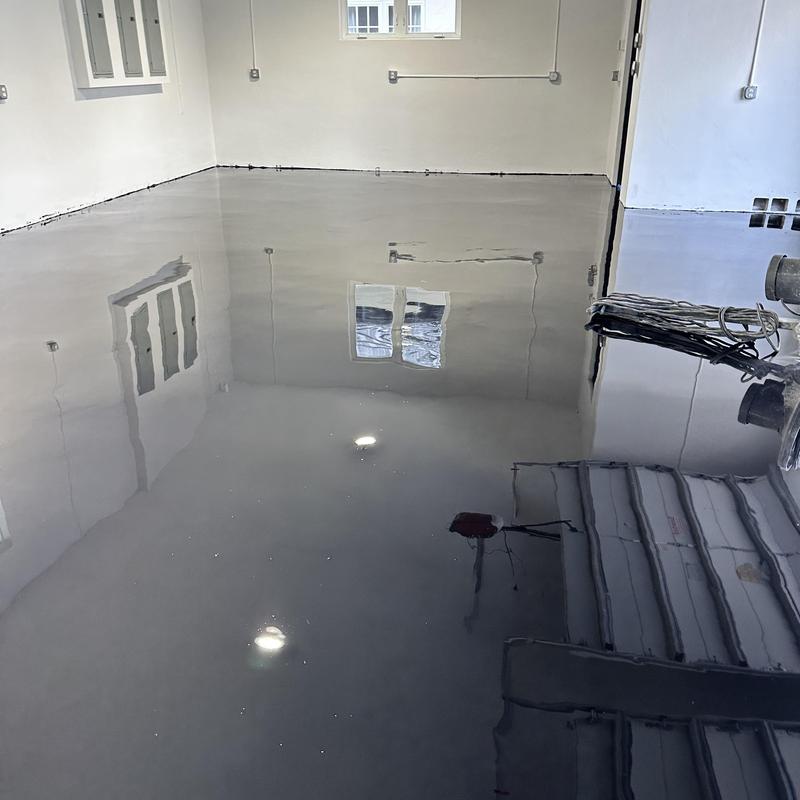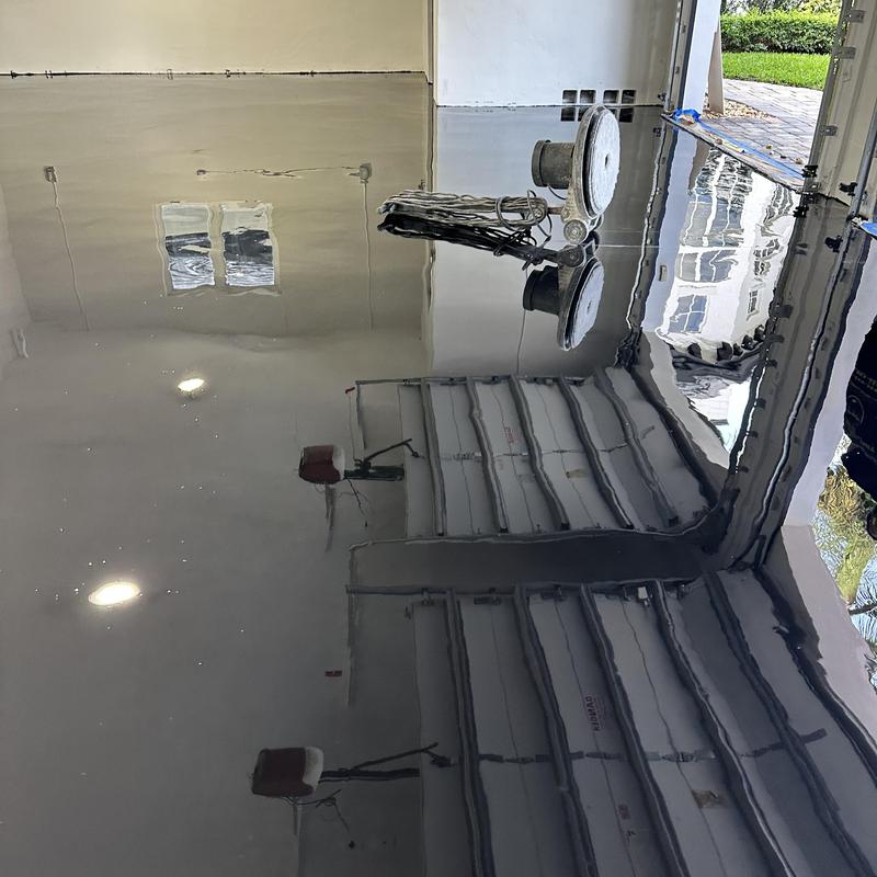 Exclusive Epoxy Coatings prepared a garage floor in Fort Lauderdale, Florida for an epoxy flake system. The team ground and repaired the surface, then planned to apply an epoxy moisture vapor barrier to improve surface readiness before the final coating installation.