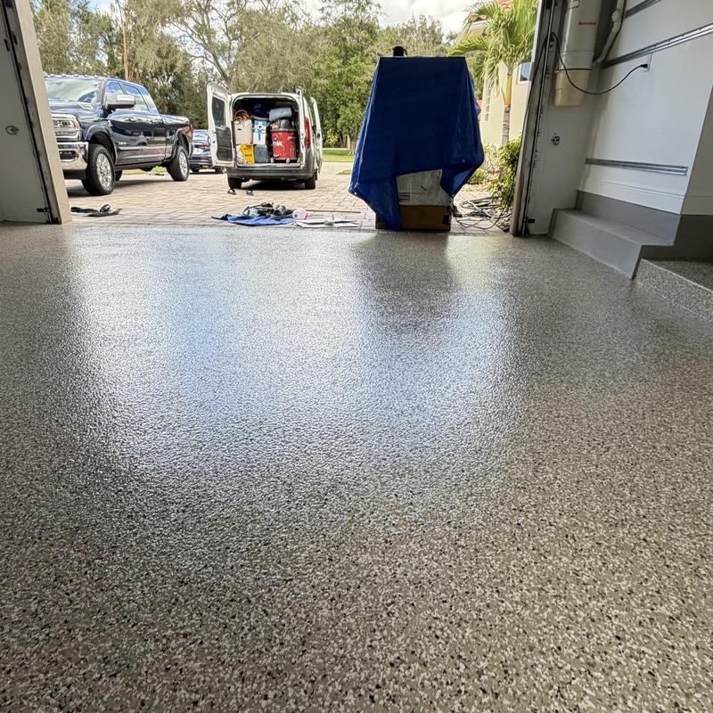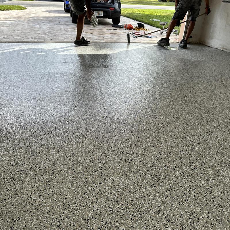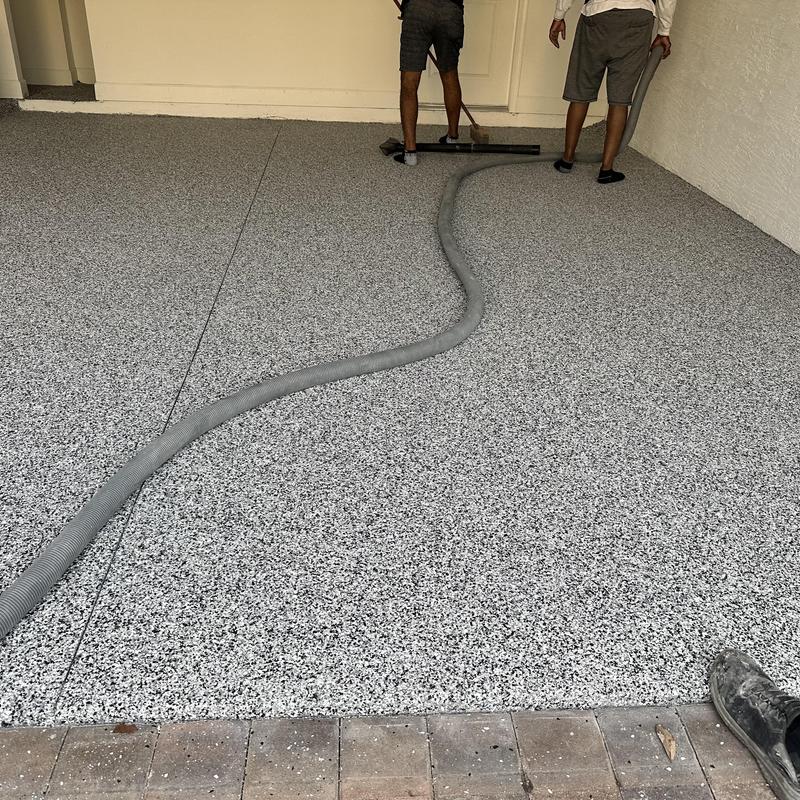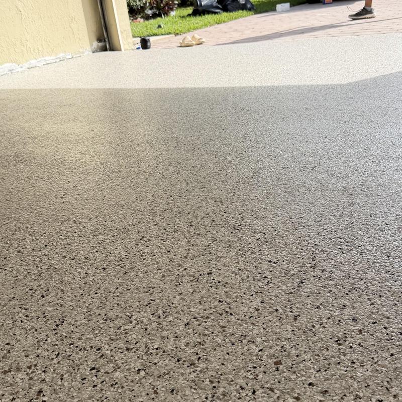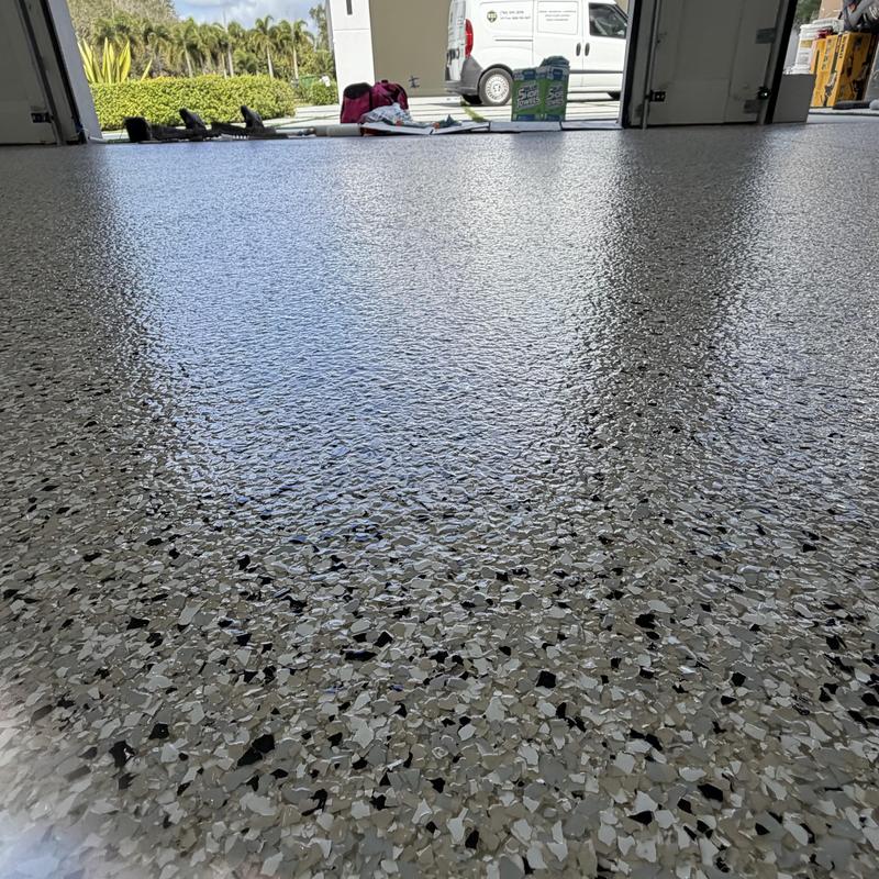 Exclusive Epoxy Coatings applied an Epoxy Gravel Flake system on a garage floor in Pembroke Pines, Florida. The process included floor grinding, an epoxy vapor barrier base, a full flake broadcast, and a polyaspartic topcoat for added durability and coverage.