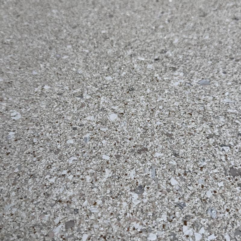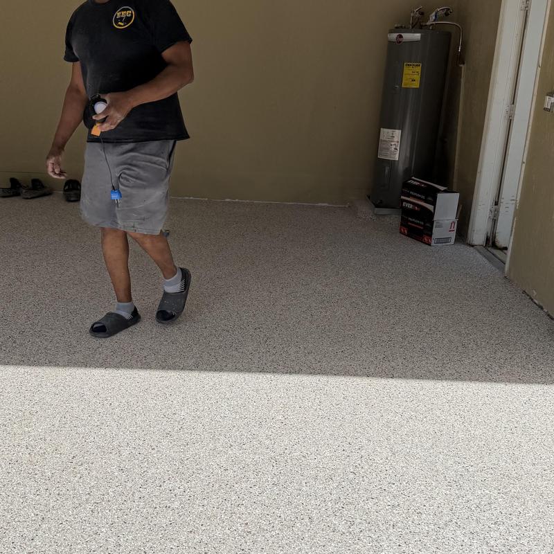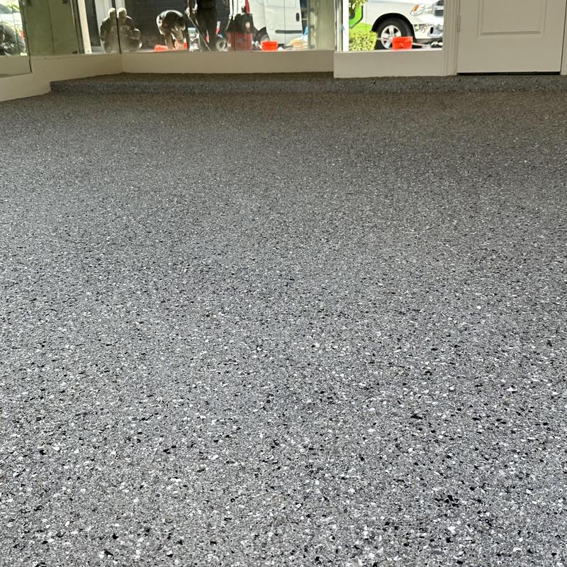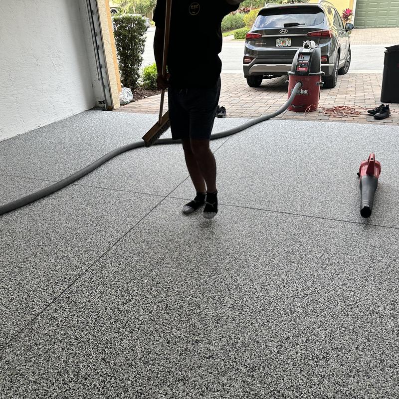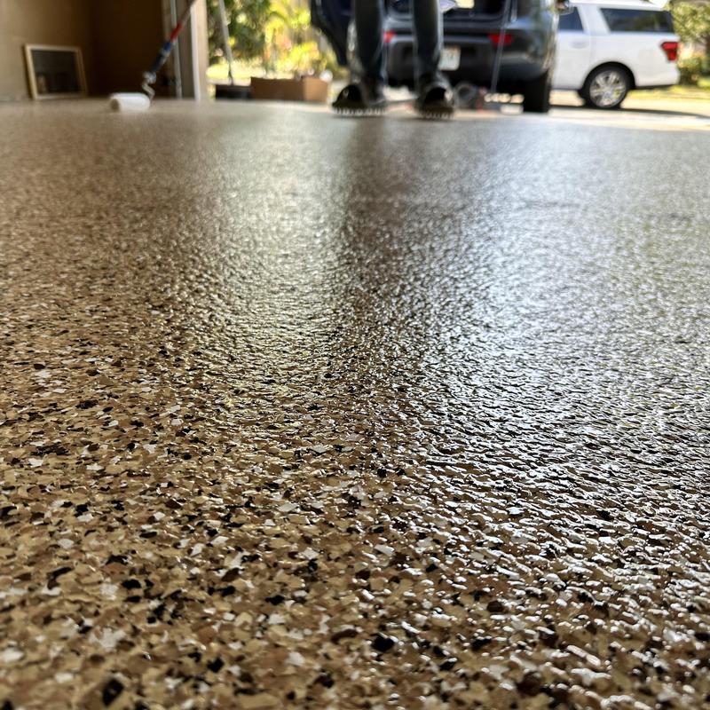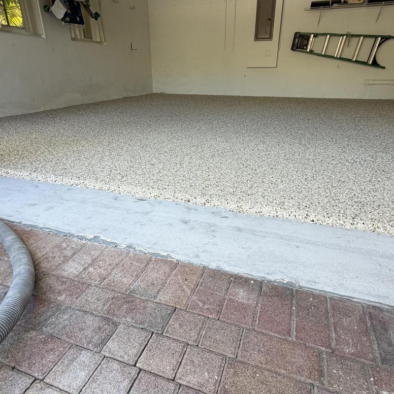 Exclusive Epoxy Coatings applied an Epoxy Gravel Flake system on a garage floor in Pembroke Pines, Florida. The process included floor grinding, an epoxy vapor barrier base, a full flake broadcast, and a polyaspartic topcoat for added durability and coverage.