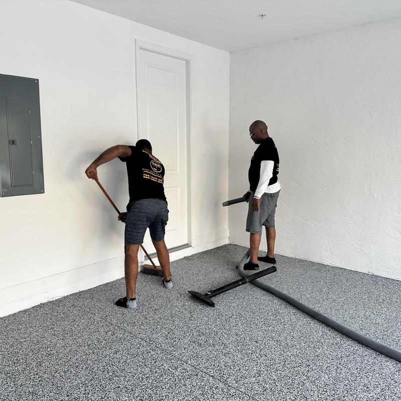 Exclusive Epoxy Coatings installed an epoxy domino flake system on a garage floor in Miramar, Florida. The team completed the one-day installation between 8 a.m. and 4 p.m. This process included floor preparation, coating application, and flake broadcast within a single workday.