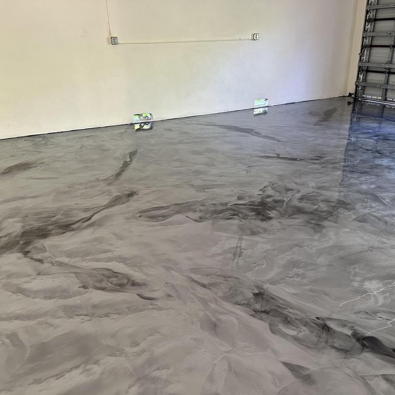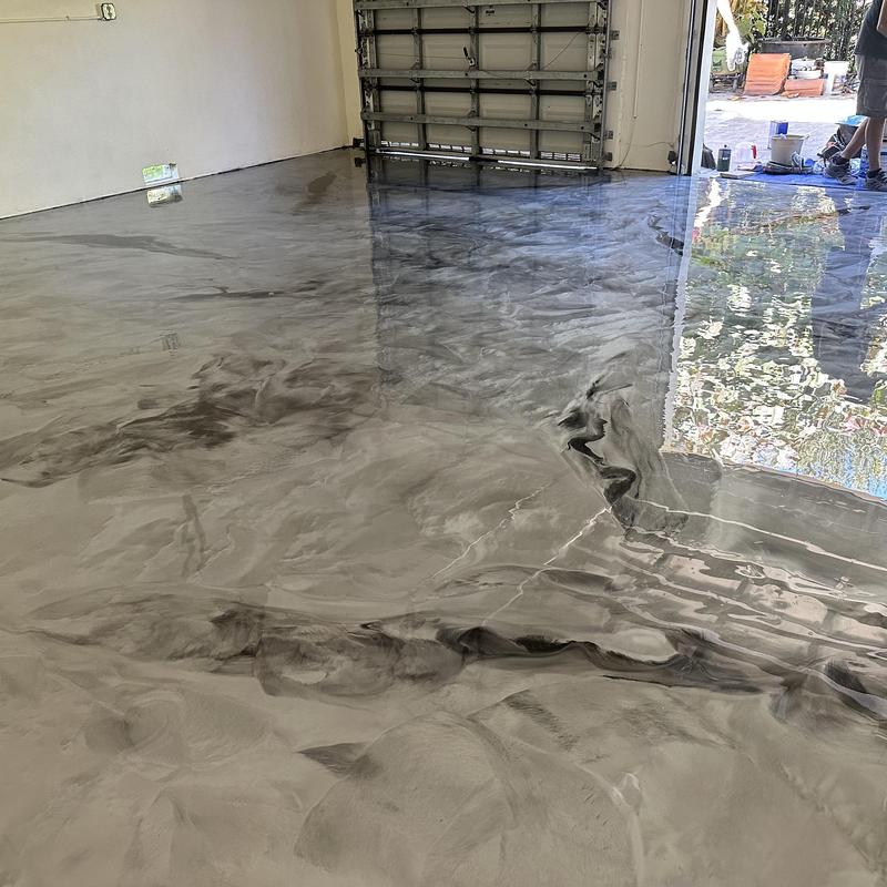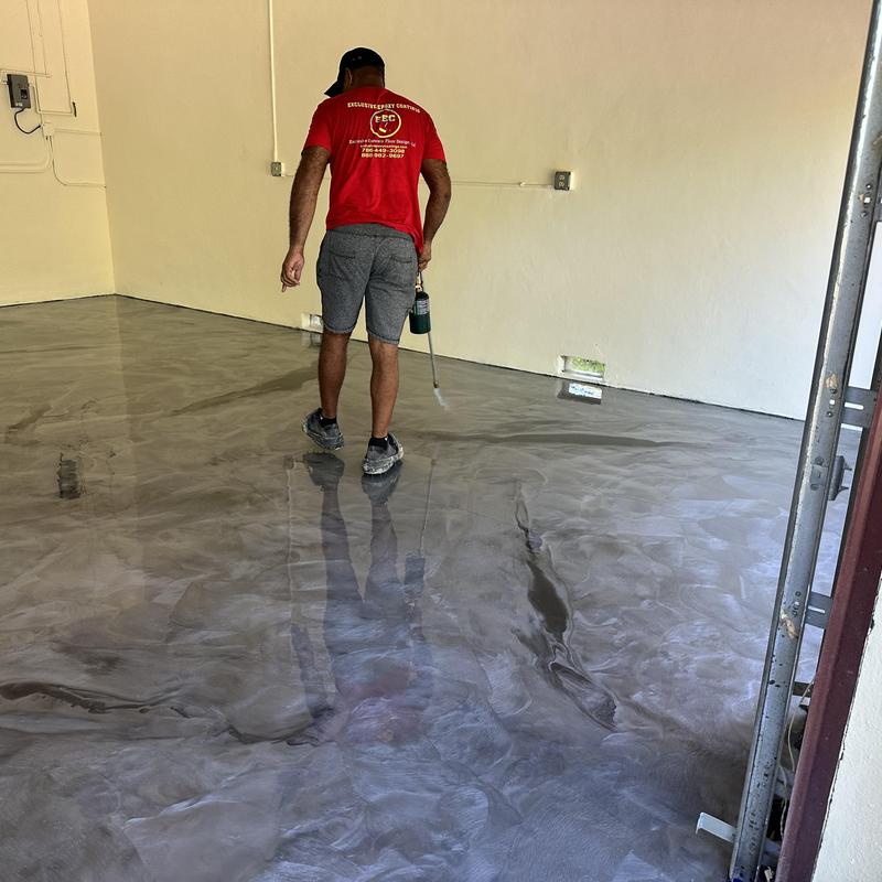 Exclusive Epoxy Coatings applied metallic silver and white epoxy pigments to create a custom floor design in Davie, Florida. The team used precise color blending techniques to achieve a smooth, high-gloss finish suitable for residential or commercial interiors.
