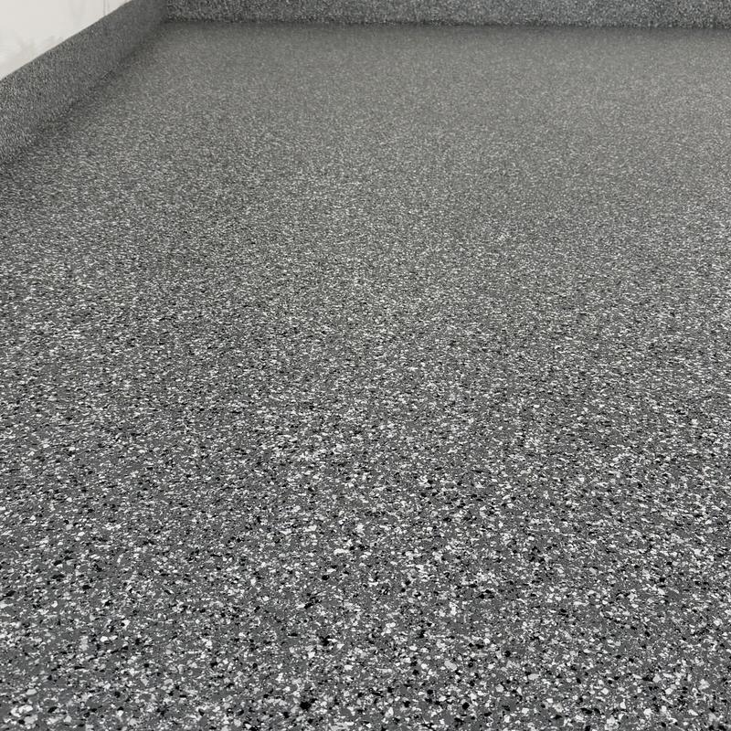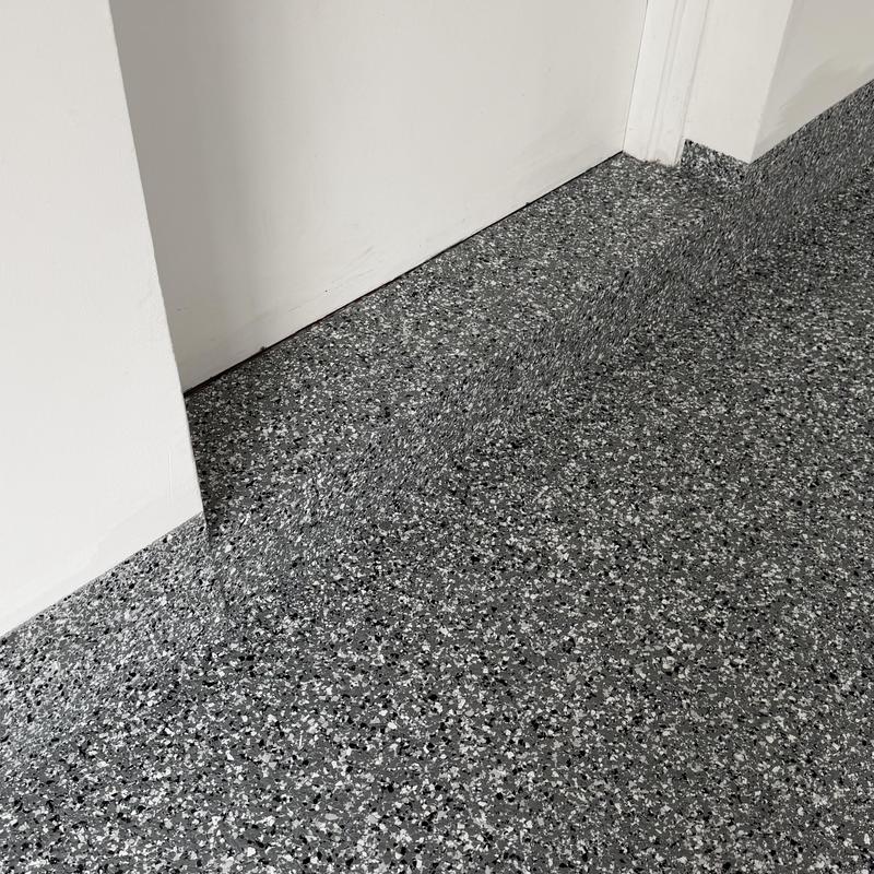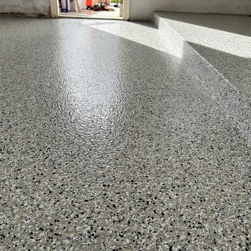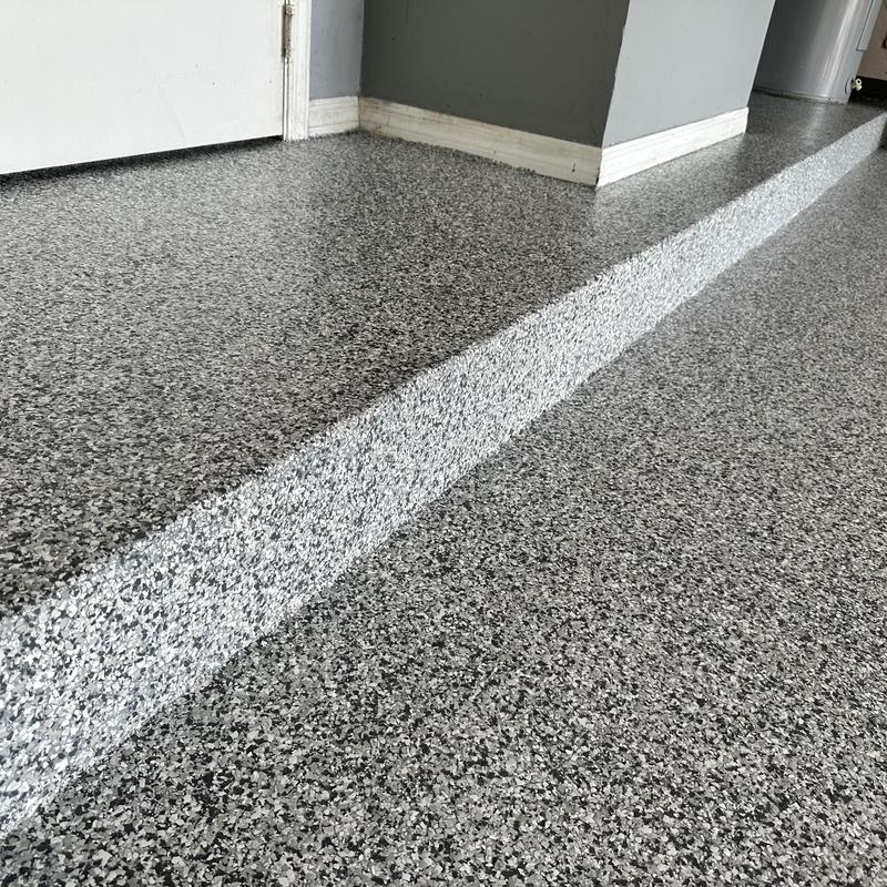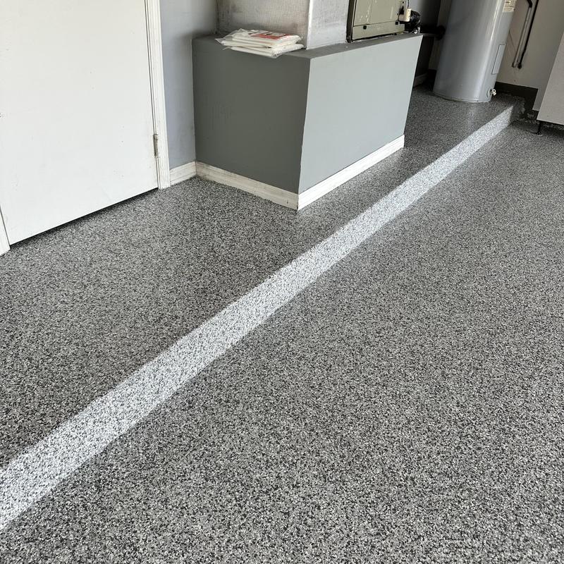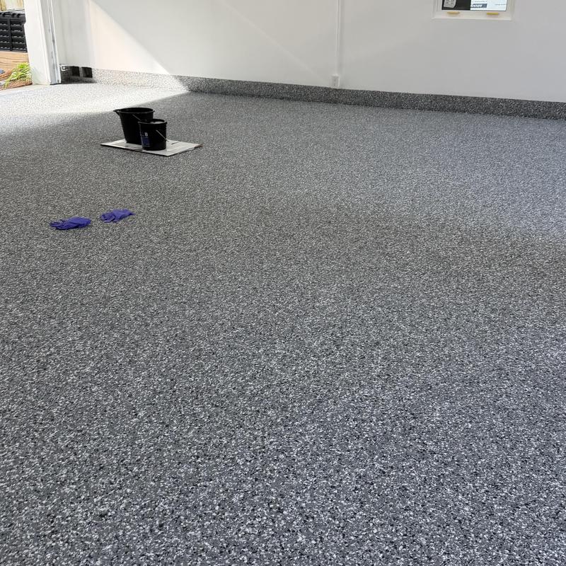Exclusive Epoxy Coatings removed two layers of existing paint from a garage floor in Atlanta, Georgia. The team then prepared the surface to the correct concrete surface profile (CSP) and applied an epoxy hybrid stone flake coating.