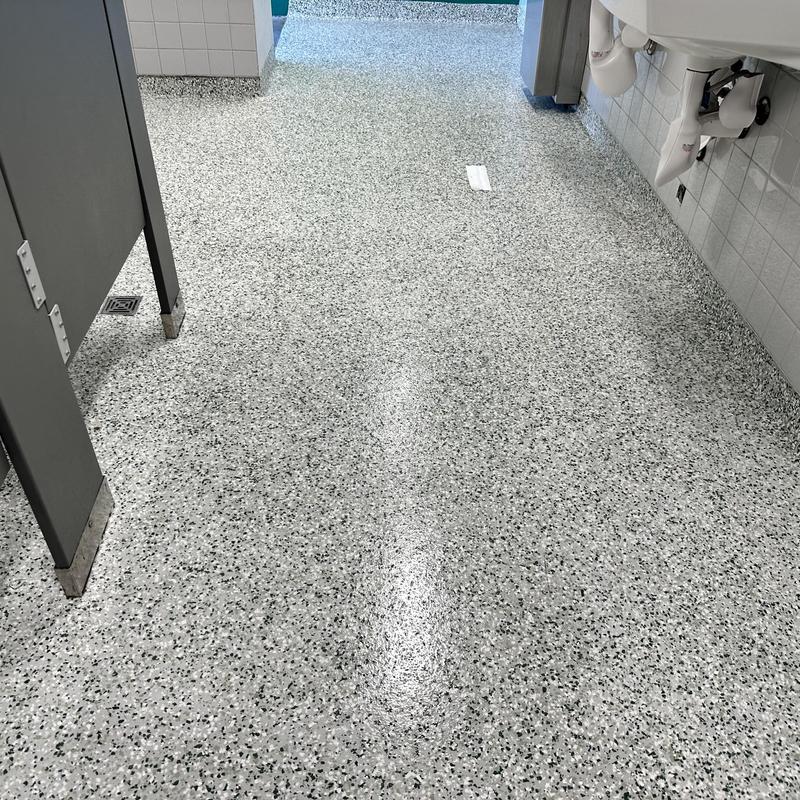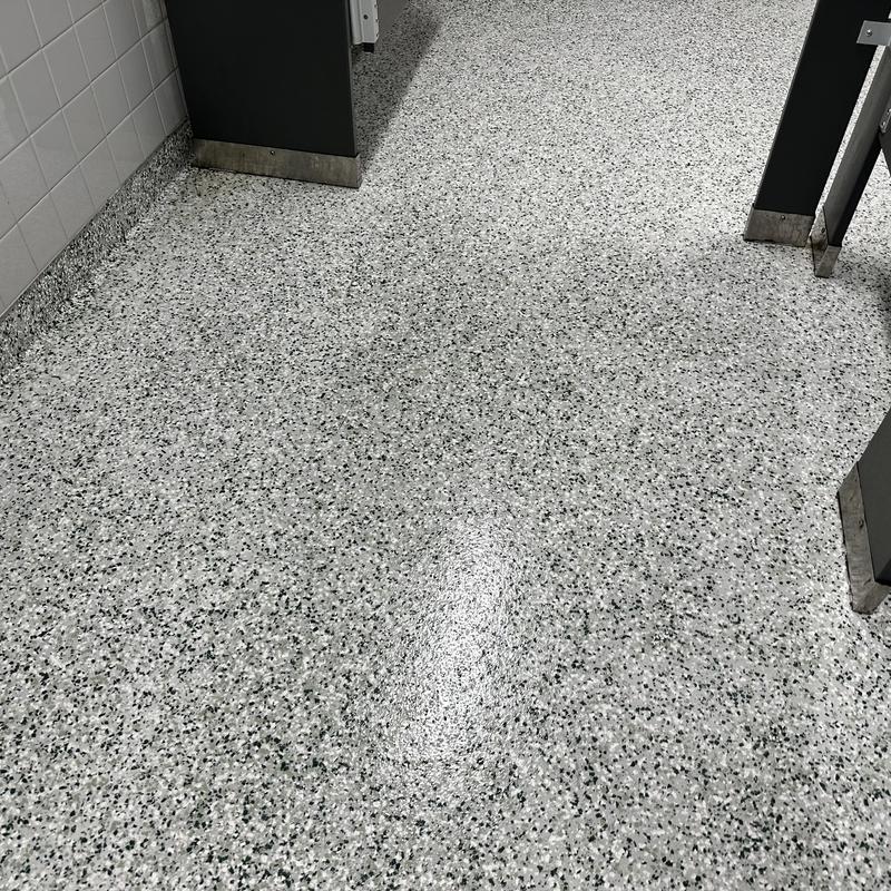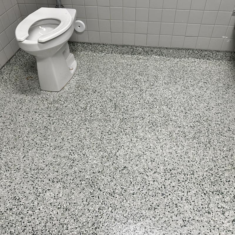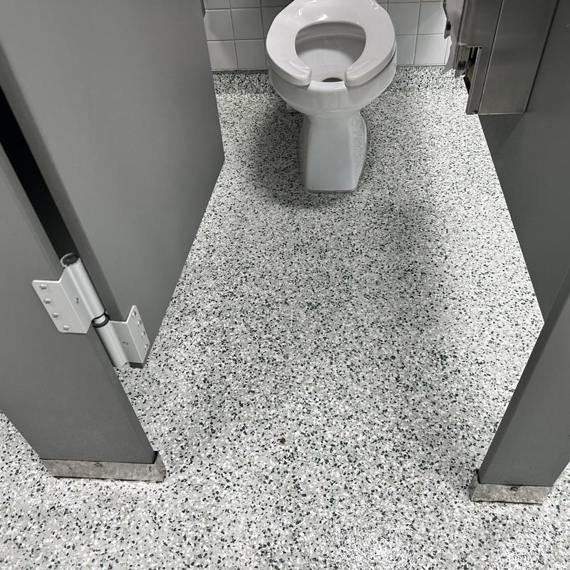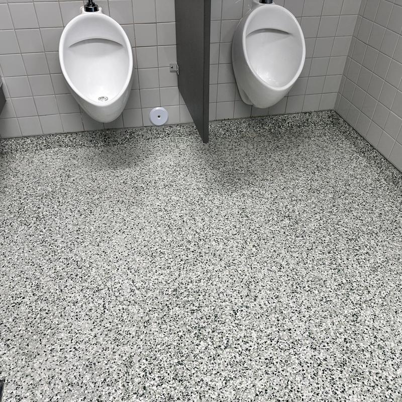 Exclusive Epoxy Coatings installed an epoxy gravel flake system in a commercial restroom in Sunny Isles Beach, Florida, enhancing surface durability and simplifying maintenance in busy, moisture-prone environments.