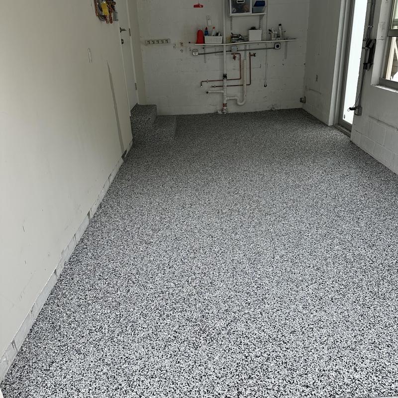Exclusive Epoxy Coatings installed an epoxy domino flake system on a garage floor in Davie, Florida. The team applied a durable coating designed to improve surface strength and appearance. This project enhanced the garage's flooring with a precise flake pattern for lasting performance.