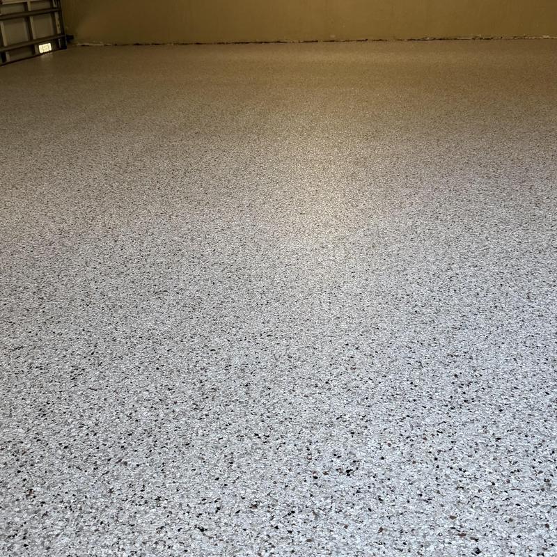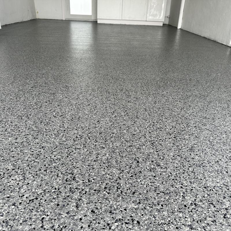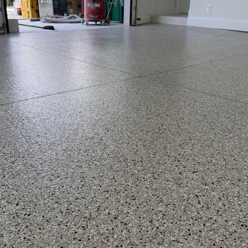 Exclusive Epoxy Coatings installed a one-day epoxy Cabin Fever flake system on a garage floor in Miramar, Florida. This coating provides consistent surface coverage and improves floor durability.