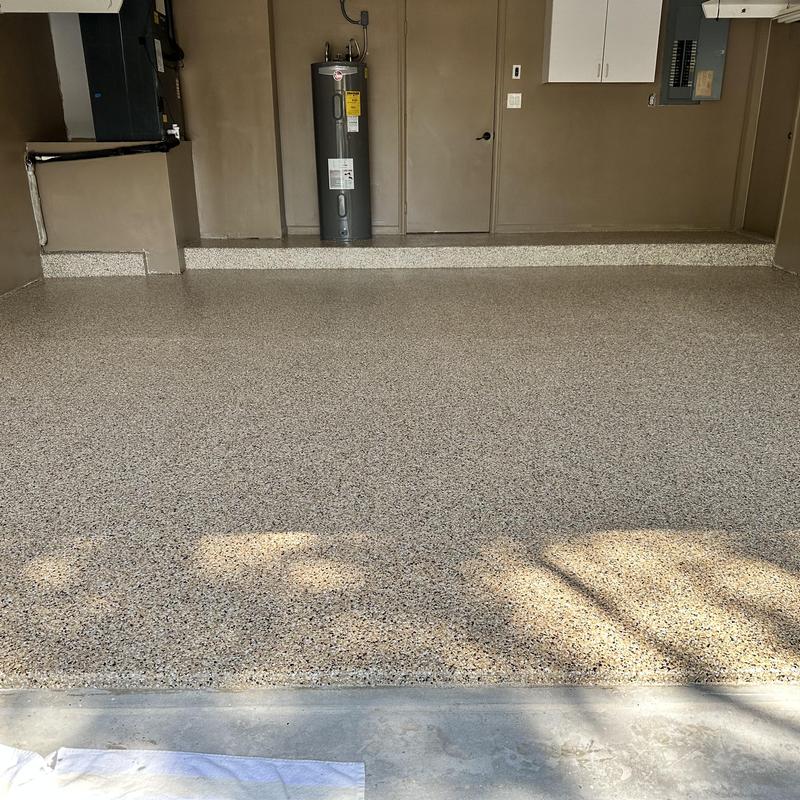 Exclusive Epoxy Coatings completed an Epoxy Coyote Flake garage floor in Miramar, Florida. The project required two days due to necessary surface repairs before applying the epoxy design. The service restored the garage floor and installed a durable, textured finish using flake coating.