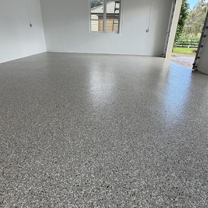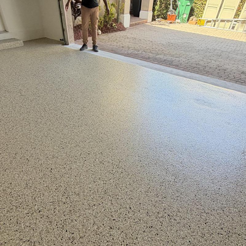Exclusive Epoxy Coatings installed an epoxy flake system on a garage floor in a new home in Delray Beach, Florida. The coating adds a durable surface that withstands heavy use and supports easier maintenance. This application improves floor performance in residential environments exposed to daily wear.