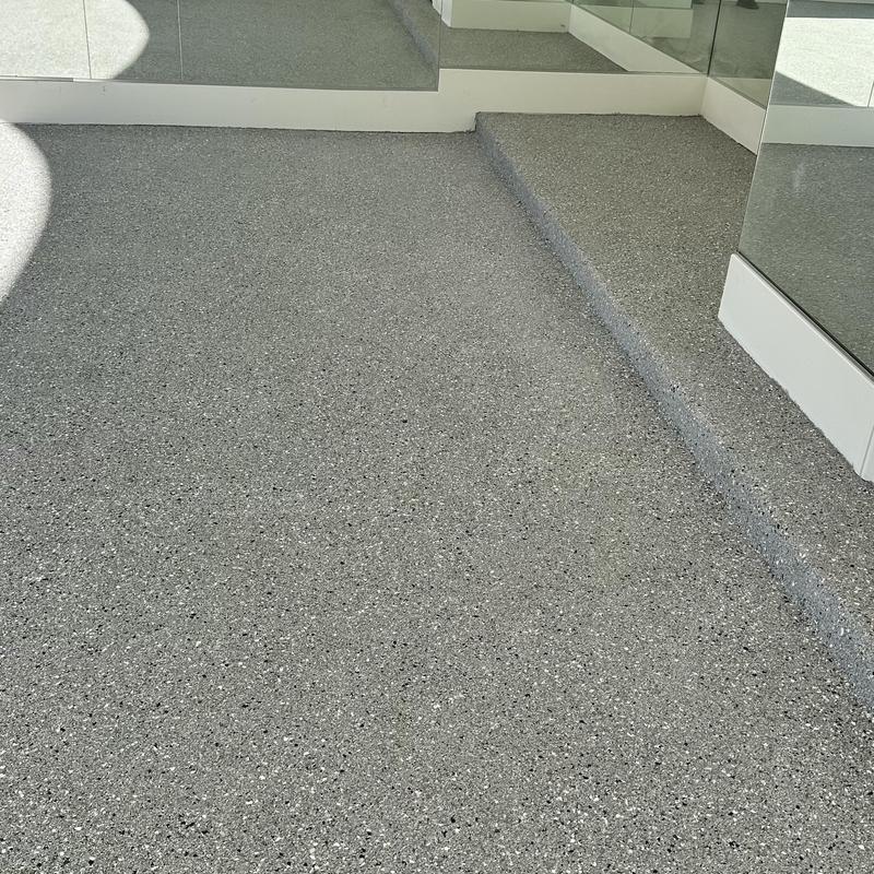 Exclusive Epoxy Coatings applied an epoxy moisture vapor barrier and broadcasted Hybrid Stone in Davie, Florida. This process helps protect concrete surfaces from moisture while adding a durable, textured overlay for lasting performance.