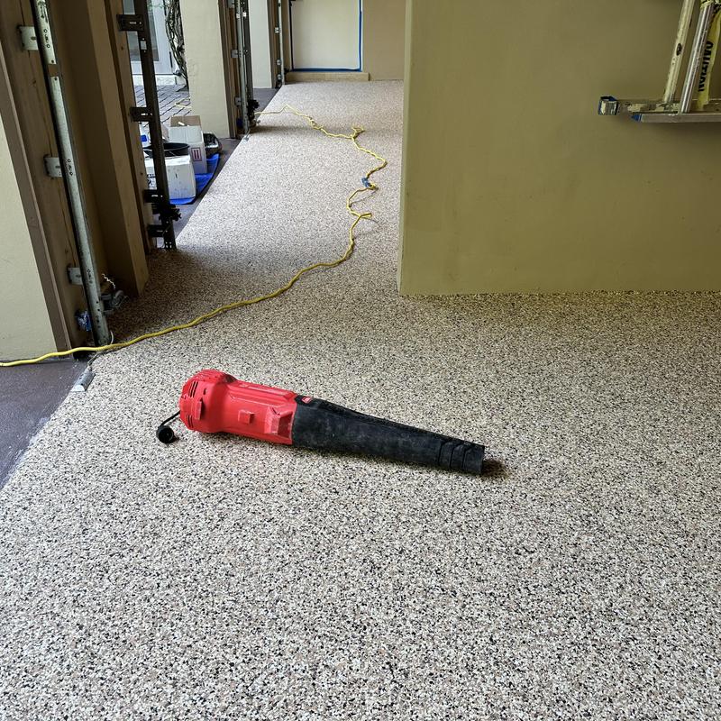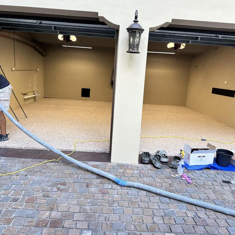 Exclusive Epoxy Coatings prepared a garage floor for an epoxy hybrid stone finish in Weston, Florida. The team completed all surface preparation steps to ensure proper bonding and long-term durability. This project focused on creating a resilient and clean surface for the decorative epoxy application.