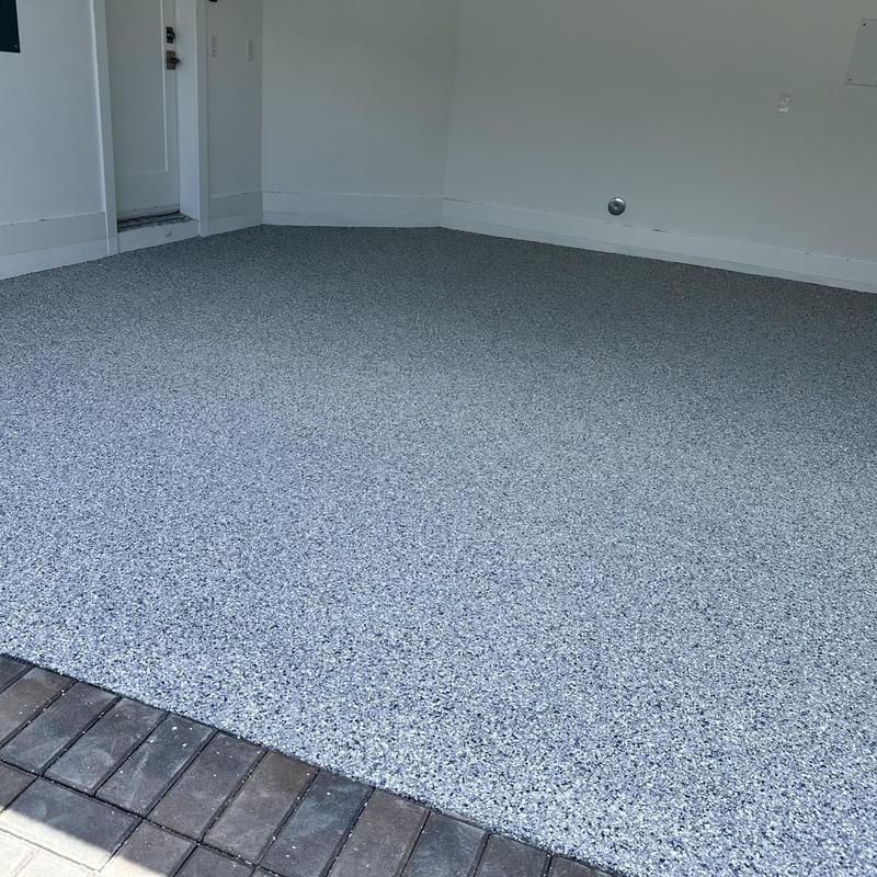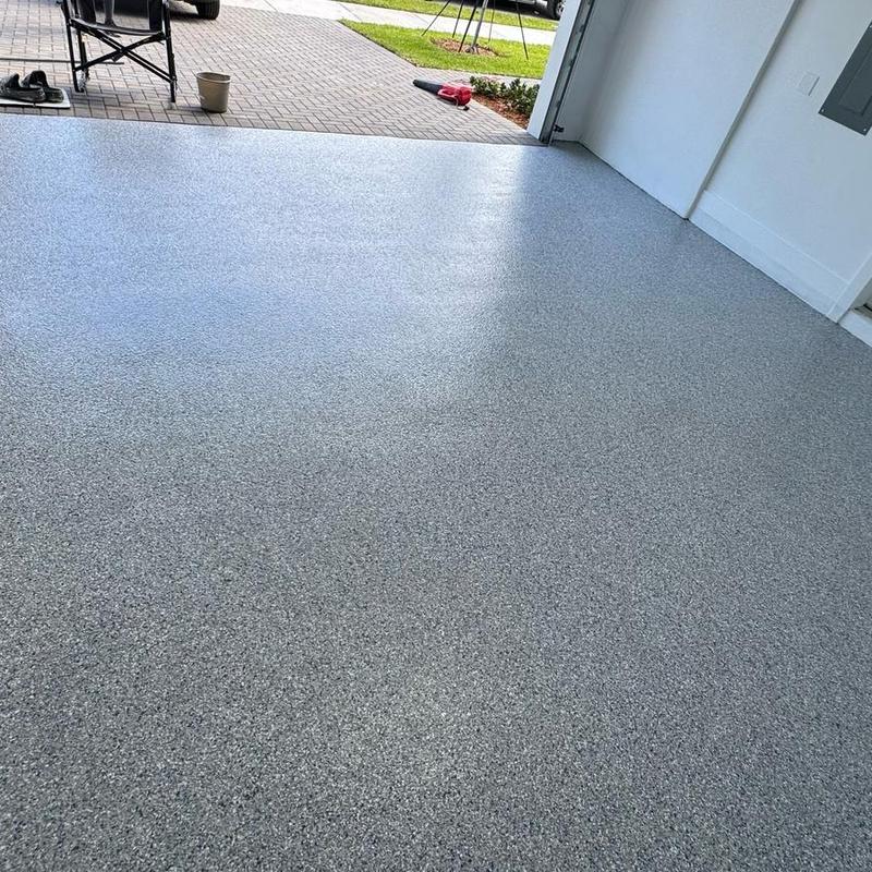 Exclusive Epoxy Coatings applied an Epoxy Gravel Flake system on a garage floor in Pembroke Pines, Florida. The process included floor grinding, an epoxy vapor barrier base, a full flake broadcast, and a polyaspartic topcoat for added durability and coverage.