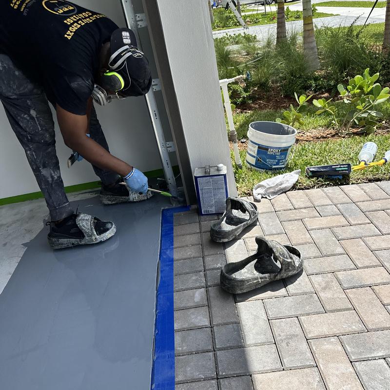 Exclusive Epoxy Coatings prepared a garage floor for an epoxy hybrid stone finish in Weston, Florida. The team completed all surface preparation steps to ensure proper bonding and long-term durability. This project focused on creating a resilient and clean surface for the decorative epoxy application.