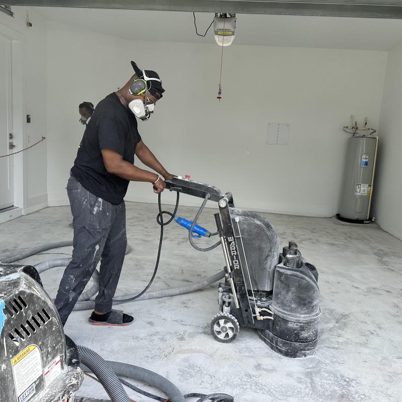Exclusive Epoxy Coatings completed garage floor preparation in Apopka, Florida. The team began grinding the surface at 8 a.m. to ensure proper adhesion for the next epoxy application stage. This process helps create a clean and even base for durable garage flooring.