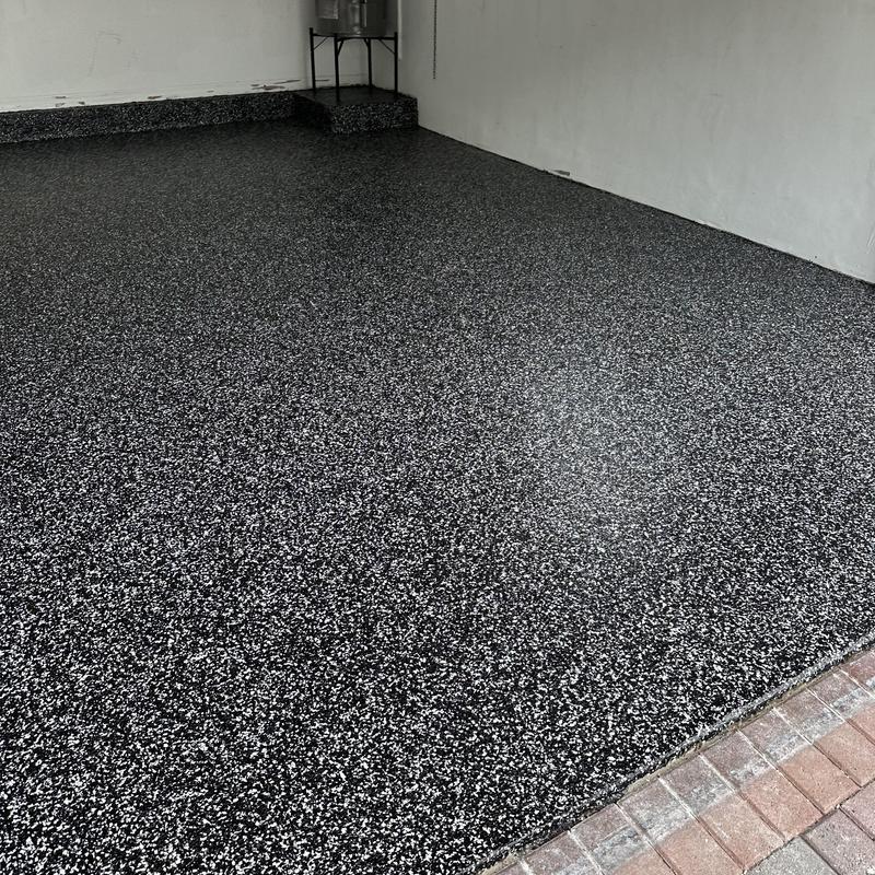 Exclusive Epoxy Coatings installed an Epoxy Carbon Marble Flake garage floor in Pembroke Pines, Florida. They applied a 100% solids epoxy base coat, followed by a full broadcast of decorative marble flakes. After surface smoothing, a clear polyaspartic topcoat was added for protection and durability.