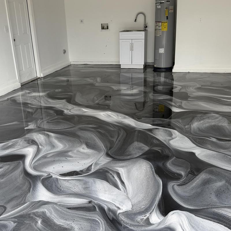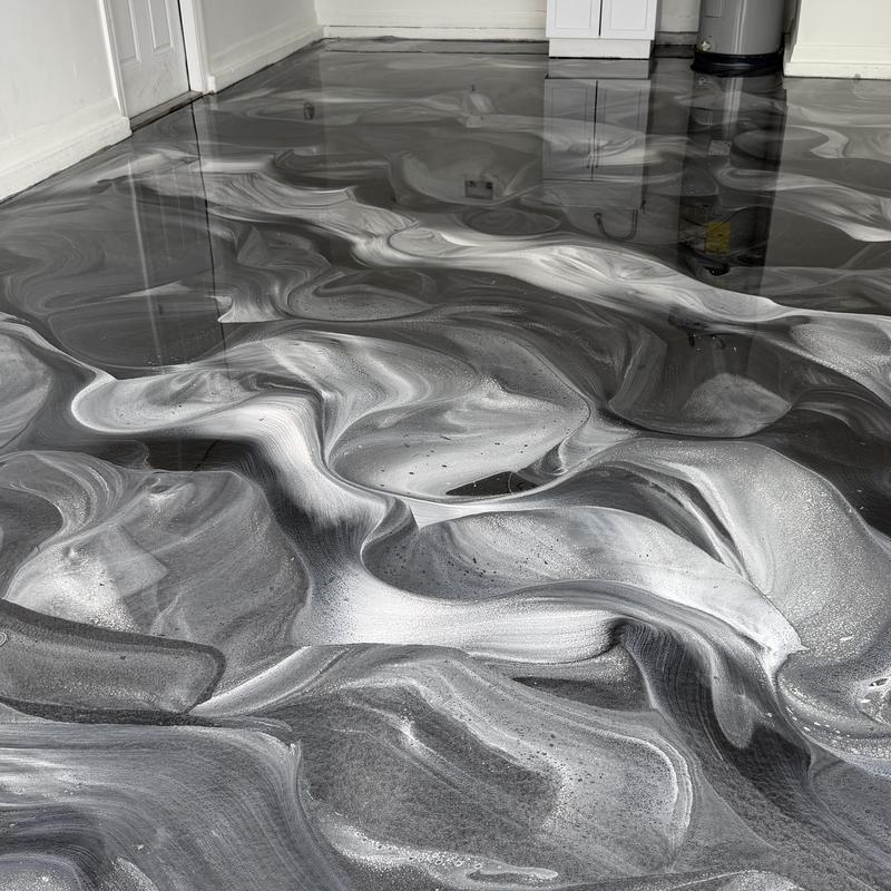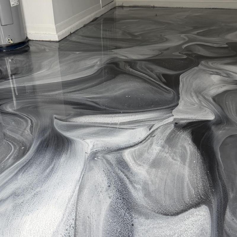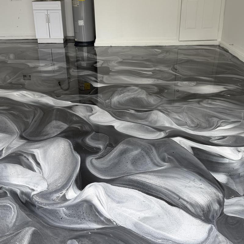 Exclusive Epoxy Coatings provides custom Liquid MarbleMetallic epoxy garage floors in Port Saint Lucie, FL. This service features metallic silver, black, and white accents to create a reflective and unique garage floor. Customers can choose any color scheme for a personalized finish.