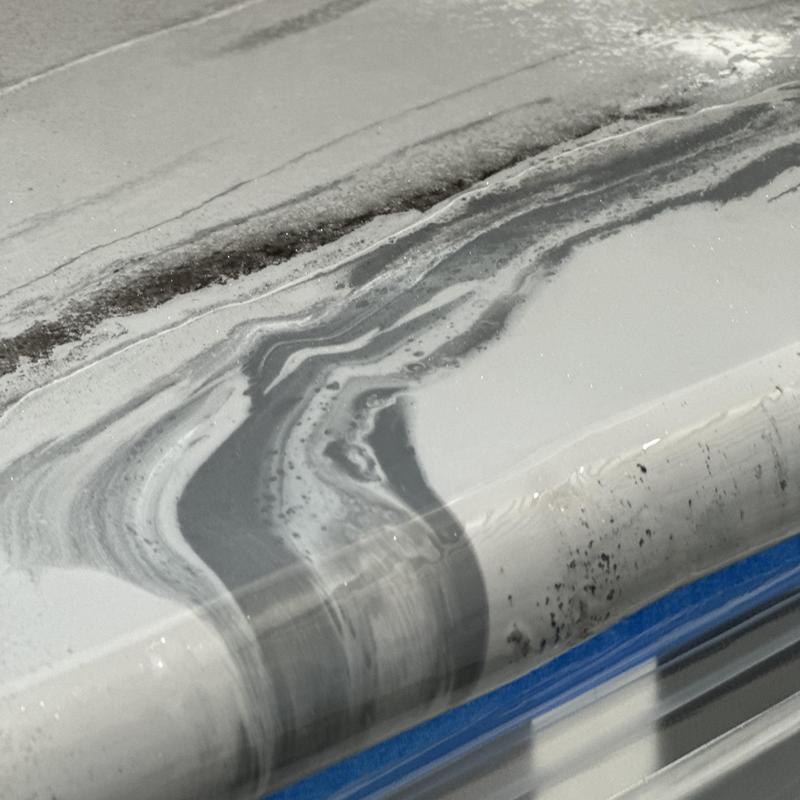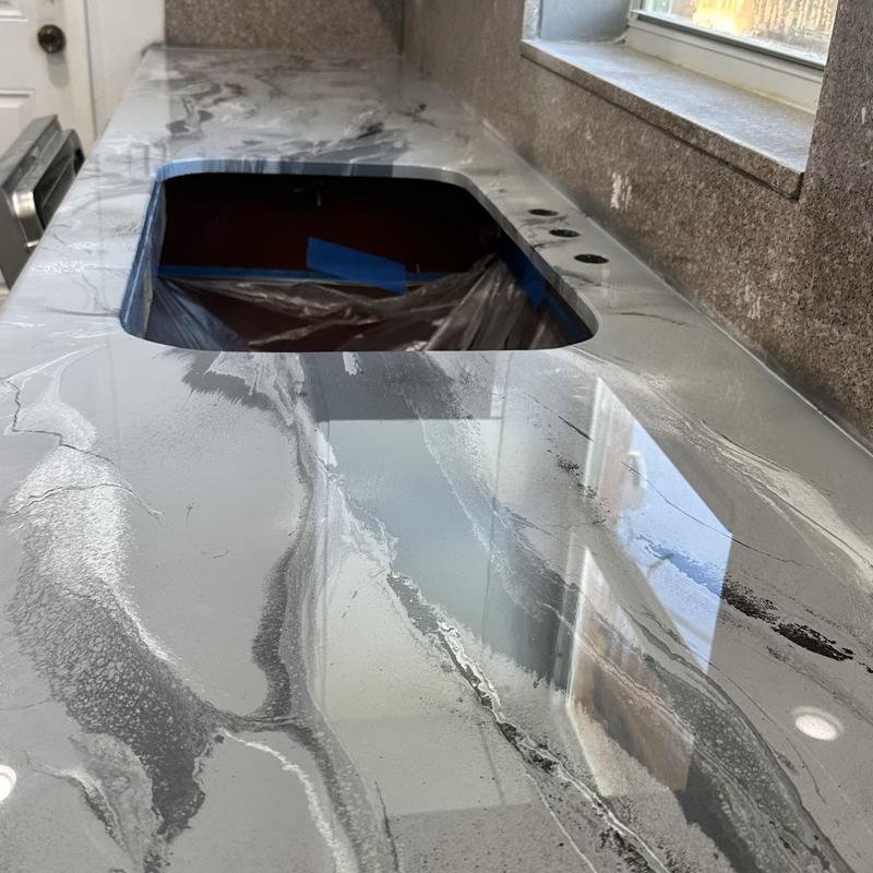Exclusive Epoxy Coatings applied a Liquid Marble Epoxy finish over an existing granite countertop in Miami, Florida. The team cleaned, sanded, and primed the surface before installing the new design. This process updated the countertop without removing the original granite.