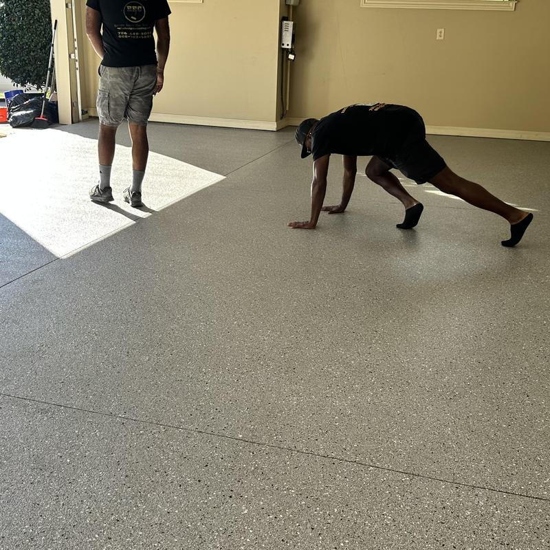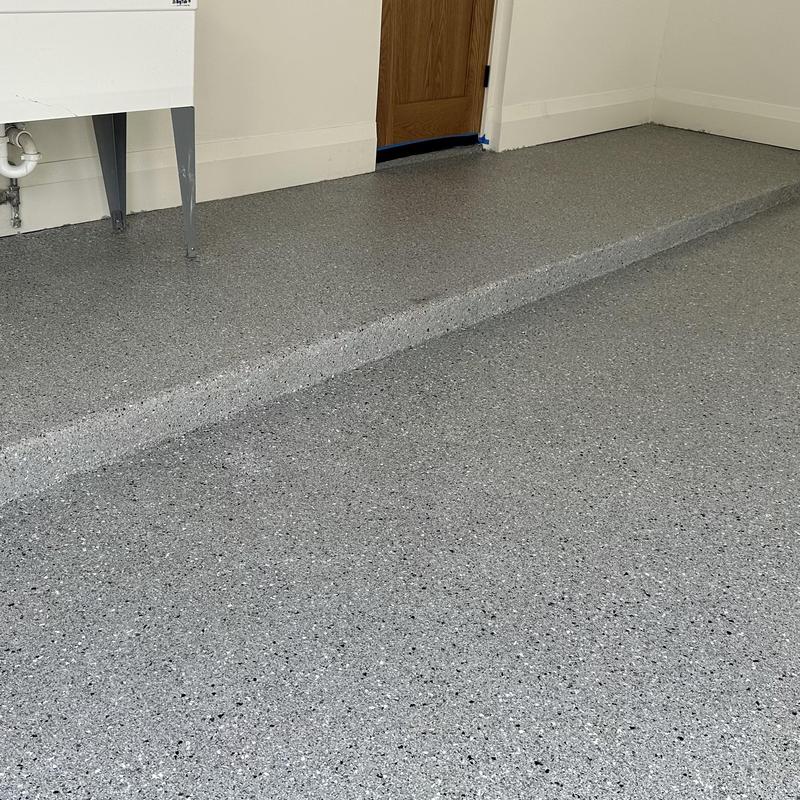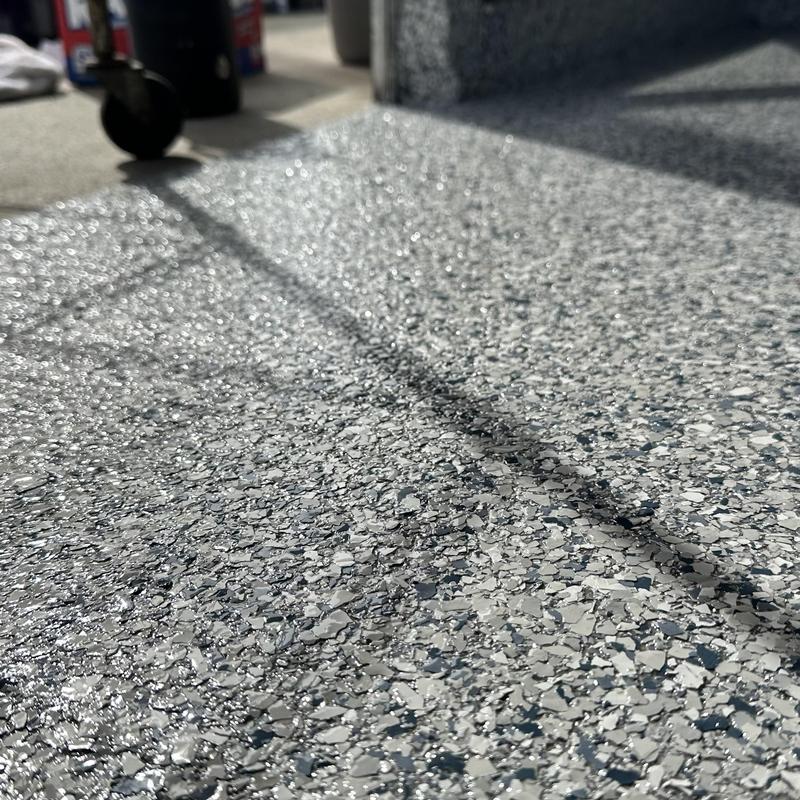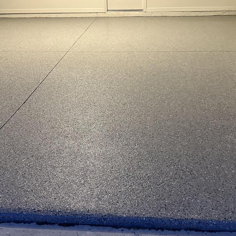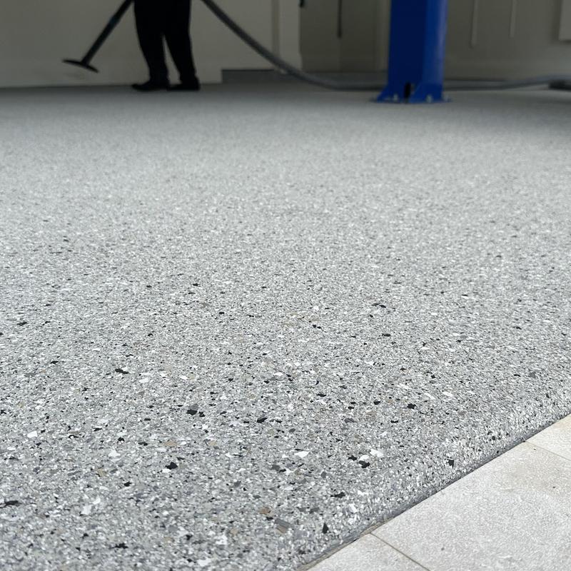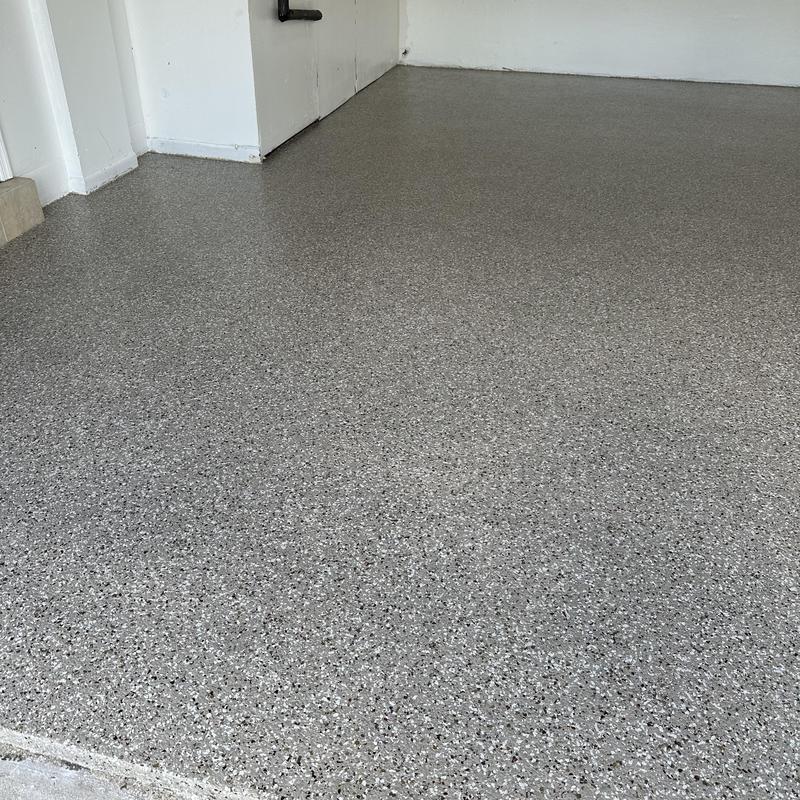Exclusive Epoxy Coatings removed two layers of existing paint from a garage floor in Atlanta, Georgia. The team then prepared the surface to the correct concrete surface profile (CSP) and applied an epoxy hybrid stone flake coating.