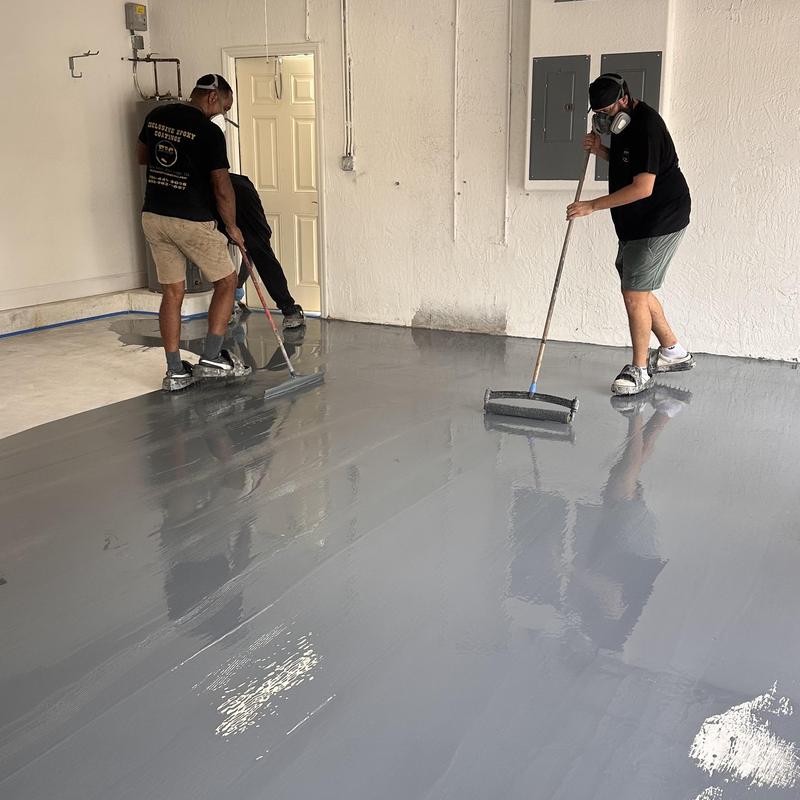 Exclusive Epoxy Coatings applied an epoxy moisture vapor barrier to a garage floor in Hallandale Beach, Florida. The barrier helps prevent ground moisture from affecting epoxy coatings. The team installs this layer on all first-floor epoxy projects for added protection in residential and commercial buildings across South Florida.