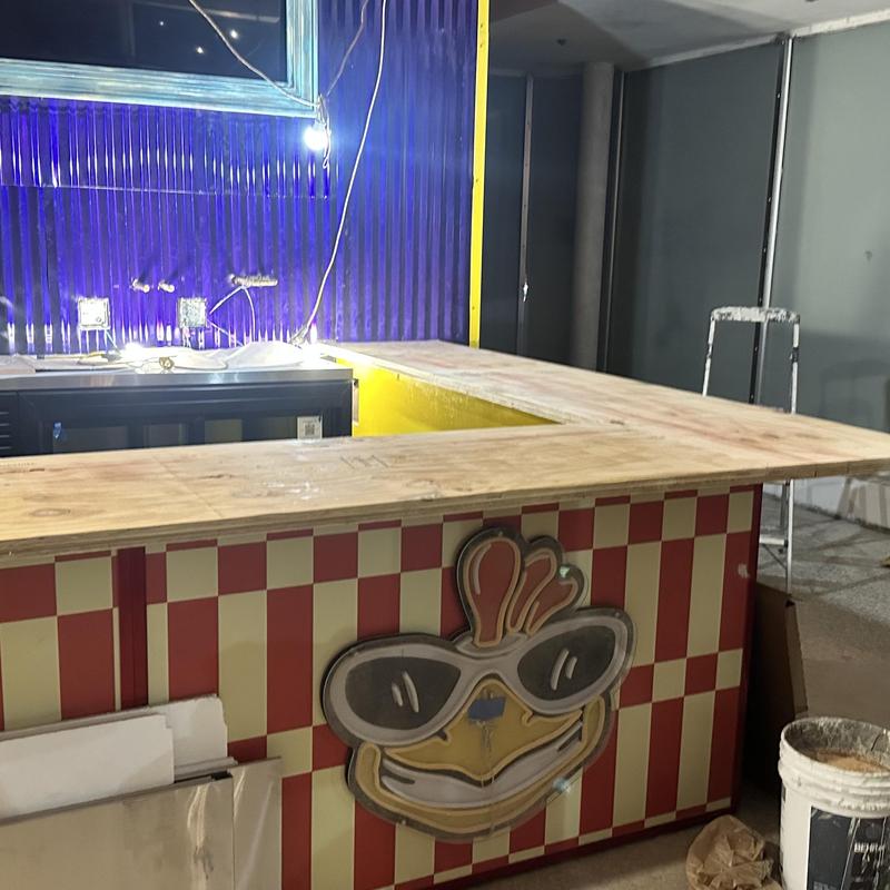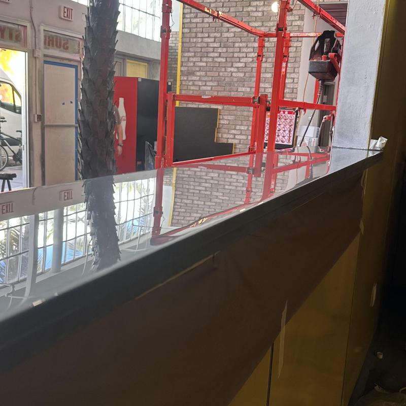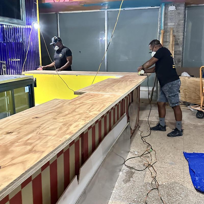 Exclusive Epoxy Coatings prepared commercial countertops in Miami, Florida. The team sanded plywood surfaces and repaired seams to create a smooth base before applying the epoxy prime coat. This process ensures strong adhesion for the final finish.