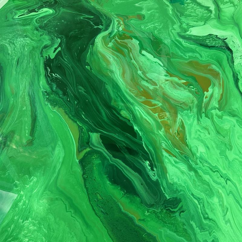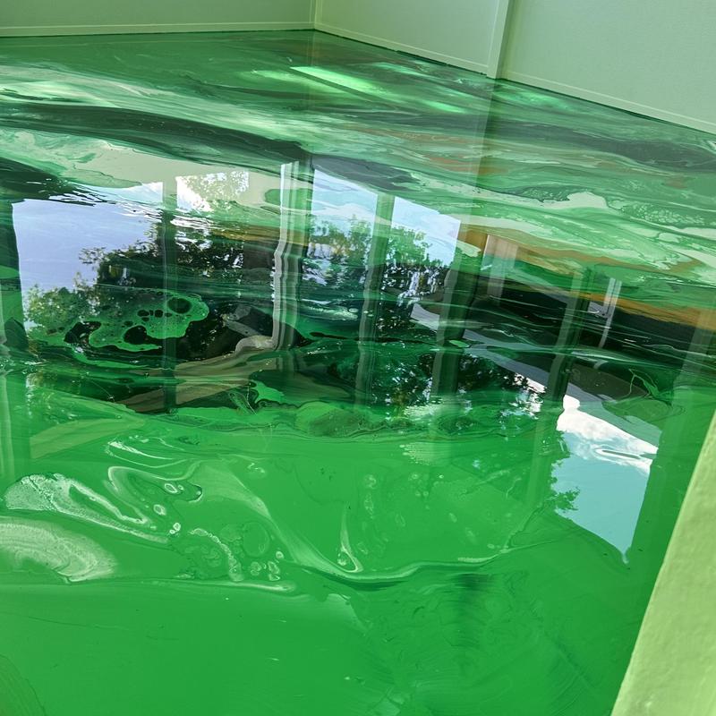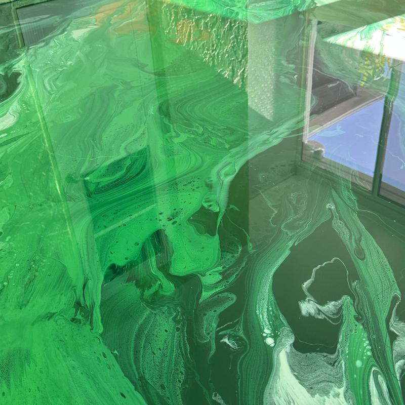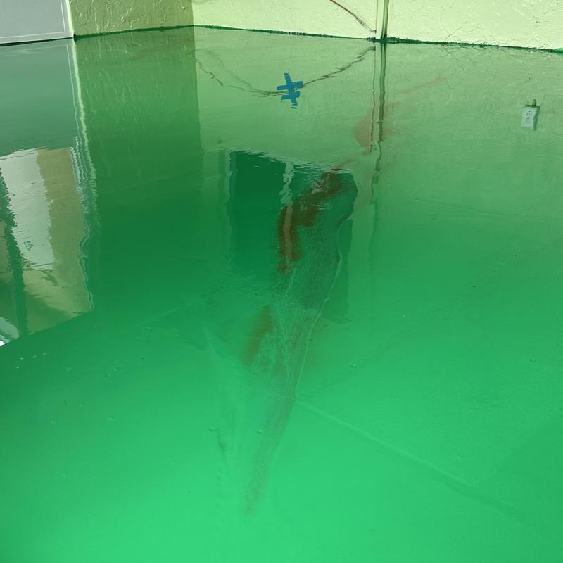 Exclusive Epoxy Coatings installed a Liquid Marble Epoxy floor in Delray Beach, Florida. The project featured a custom design using forest green, safety green, white, and gold to create a unique patterned surface.
