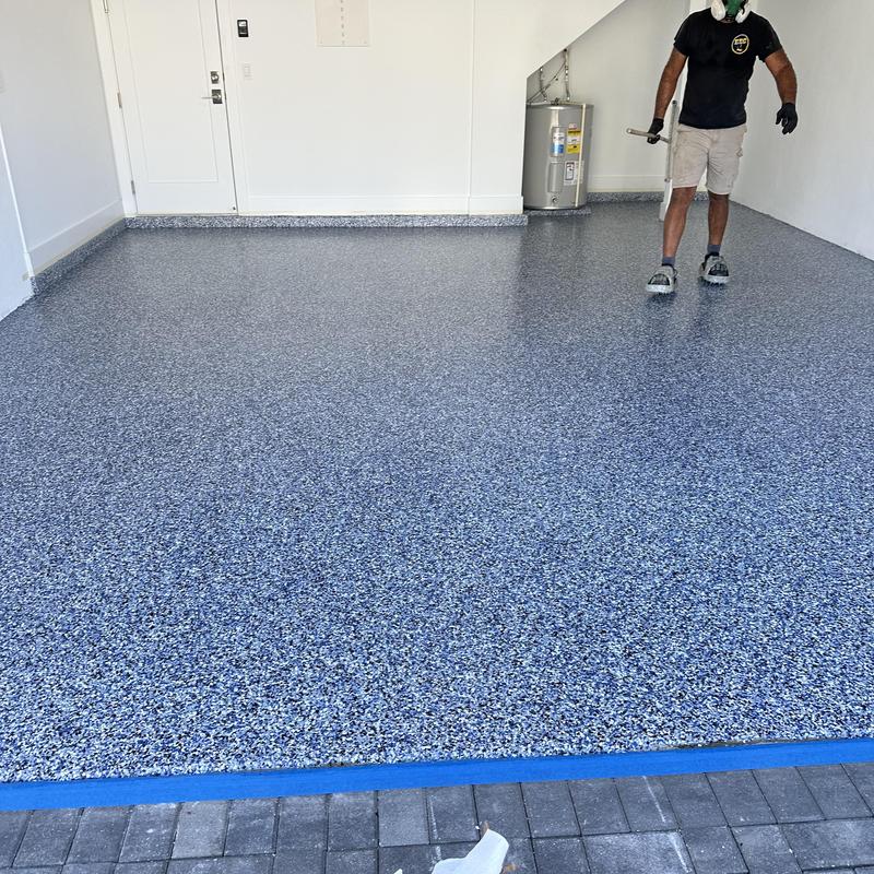 Exclusive Epoxy Coatings installed a two-day Epoxy Tidal Wave Flake system on a garage floor in Pinecrest, Florida. This project used flakes in shades of blue, gray, and white to create a durable, easy-to-clean surface suitable for both residential and industrial use.