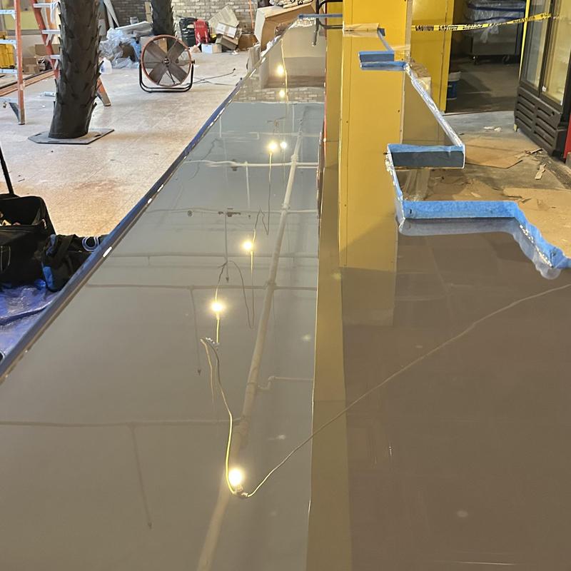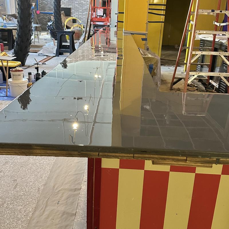 Exclusive Epoxy Coatings installed a solid gray epoxy countertop over plywood at a restaurant in South Beach, Florida. The surface provides a clean, durable finish suitable for commercial use. This epoxy application enhances functionality while maintaining a smooth appearance, making it ideal for high-traffic environments.