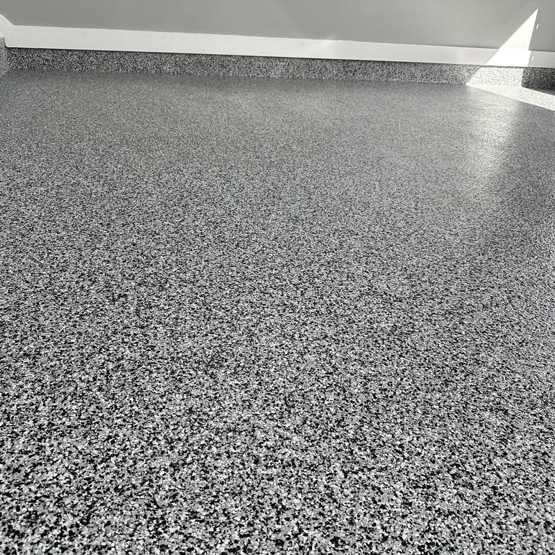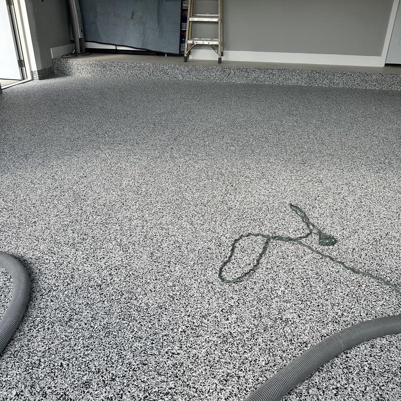 Exclusive Epoxy Coatings removed two layers of existing paint from a garage floor in Atlanta, Georgia. The team then prepared the surface to the correct concrete surface profile (CSP) and applied an epoxy hybrid stone flake coating.