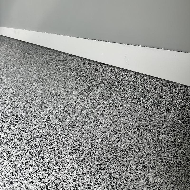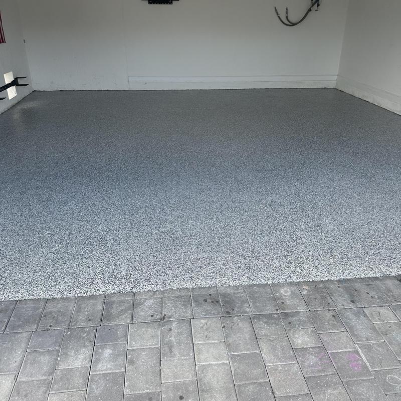 Exclusive Epoxy Coatings installed a one-day epoxy Cabin Fever flake system on a garage floor in Miramar, Florida. This coating provides consistent surface coverage and improves floor durability.