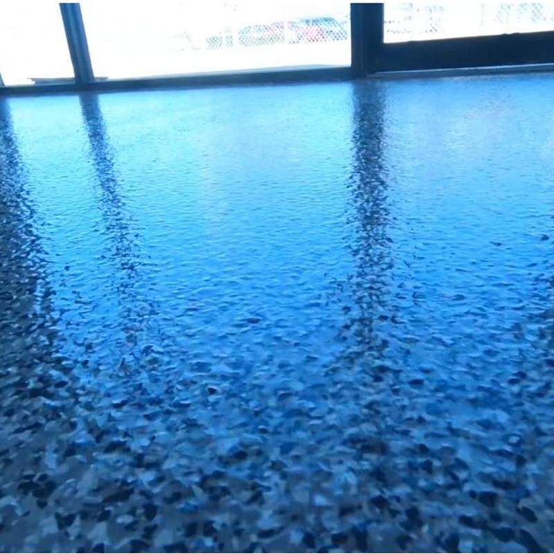 Exclusive Epoxy Coatings installed an Epoxy Tidal Wave Flake system on a commercial kitchen floor in Key Largo, Florida. The team ground the surface, performed repairs, applied a moisture vapor barrier, and broadcast 100% flakes into the epoxy until full coverage was achieved.