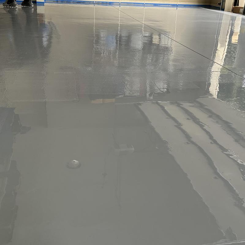 Exclusive Epoxy Coatings applied an epoxy moisture barrier after grinding and cleaning the first-story floor. This process is part of their full epoxy flooring system installation in Davie, Florida.