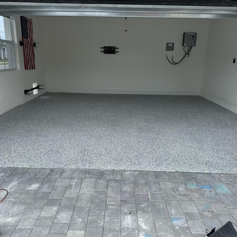 Exclusive Epoxy Coatings installed an Epoxy Shoreline Flake Garage Floor in Cocoa, Florida. The team completed the project in one day, starting at 9:00 AM and finishing at 3:30 PM. The service included a full garage floor coating using their one-day epoxy system.
