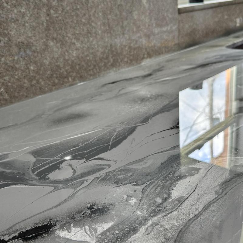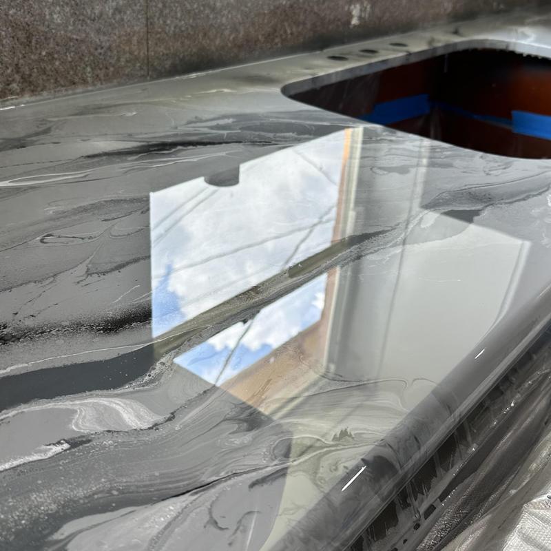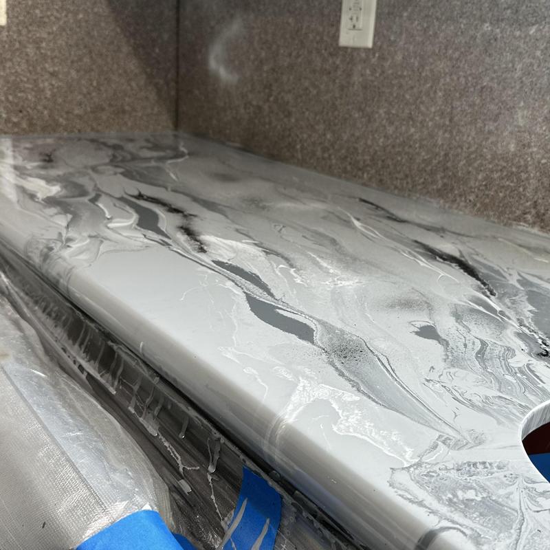 Exclusive Epoxy Coatings applied a Liquid Marble Epoxy finish over an existing granite countertop in Miami, Florida. The team cleaned, sanded, and primed the surface before installing the new design. This process updated the countertop without removing the original granite.